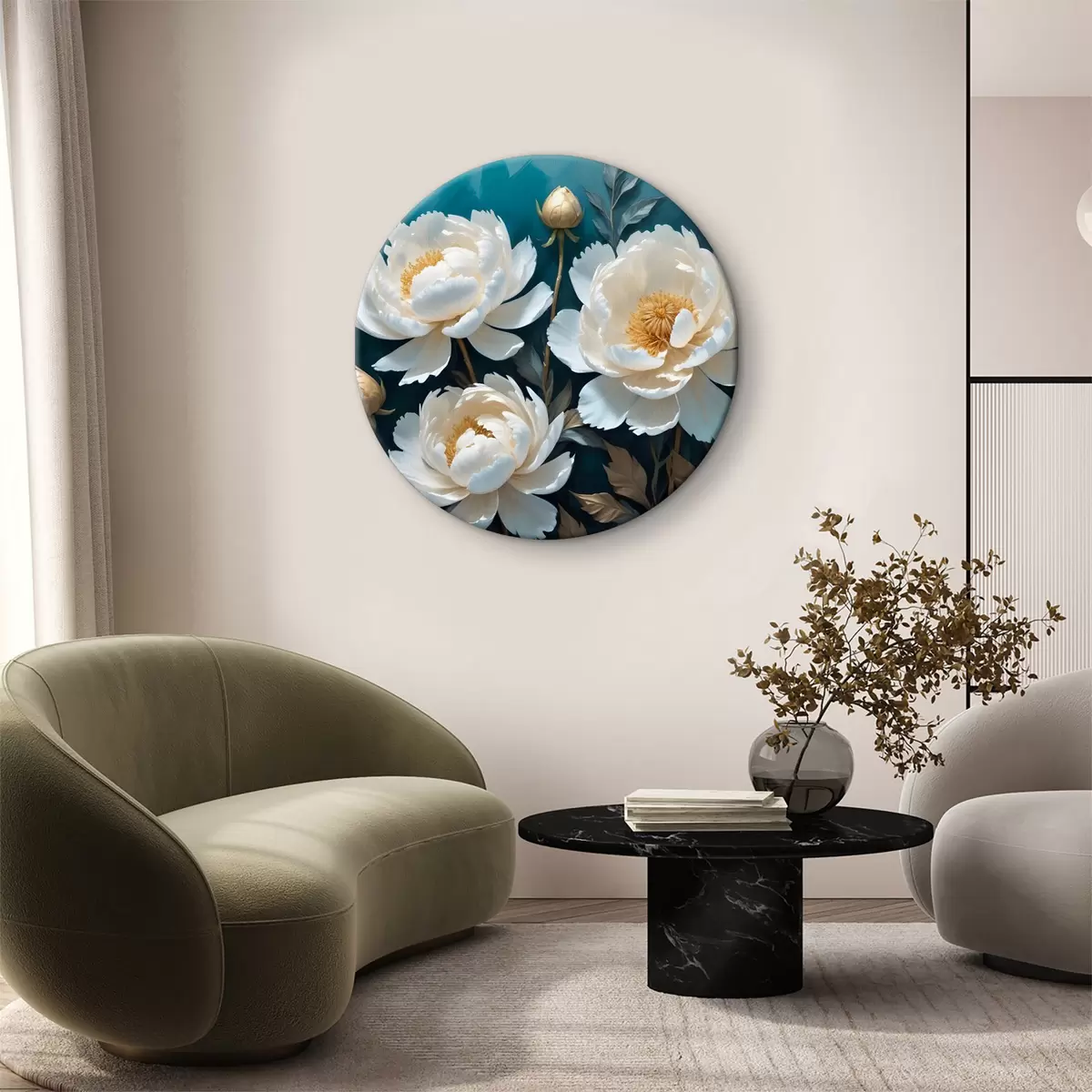 Ronde schilderijen Witte pioenbloemen met hart tegen een donkerblauwe achtergrond Nr r39405