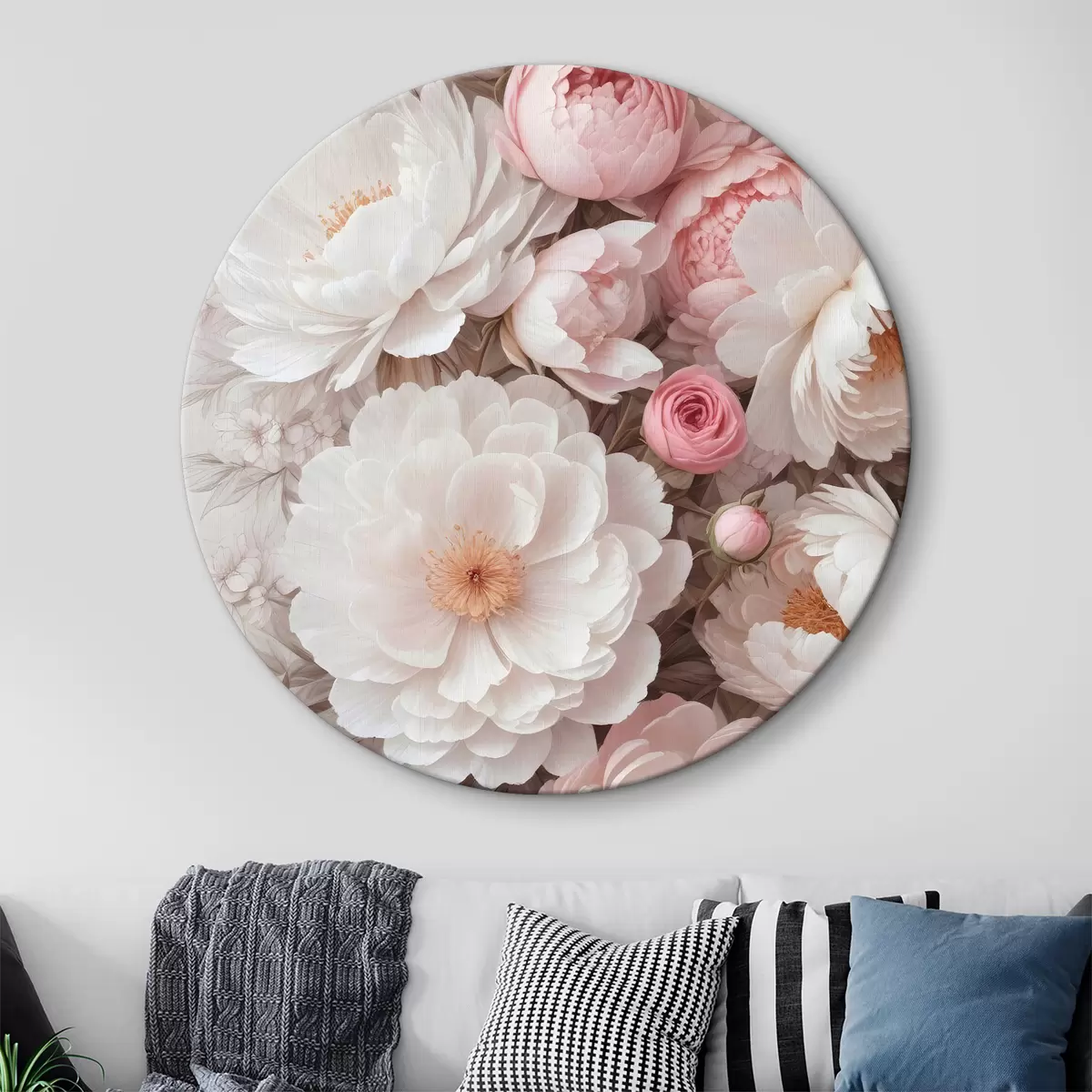 Ronde schilderijen Boeket van grote witte en roze pioenrozen met zachte, delicate bloemblaadjes tegen een lichte achtergrond Nr r39408