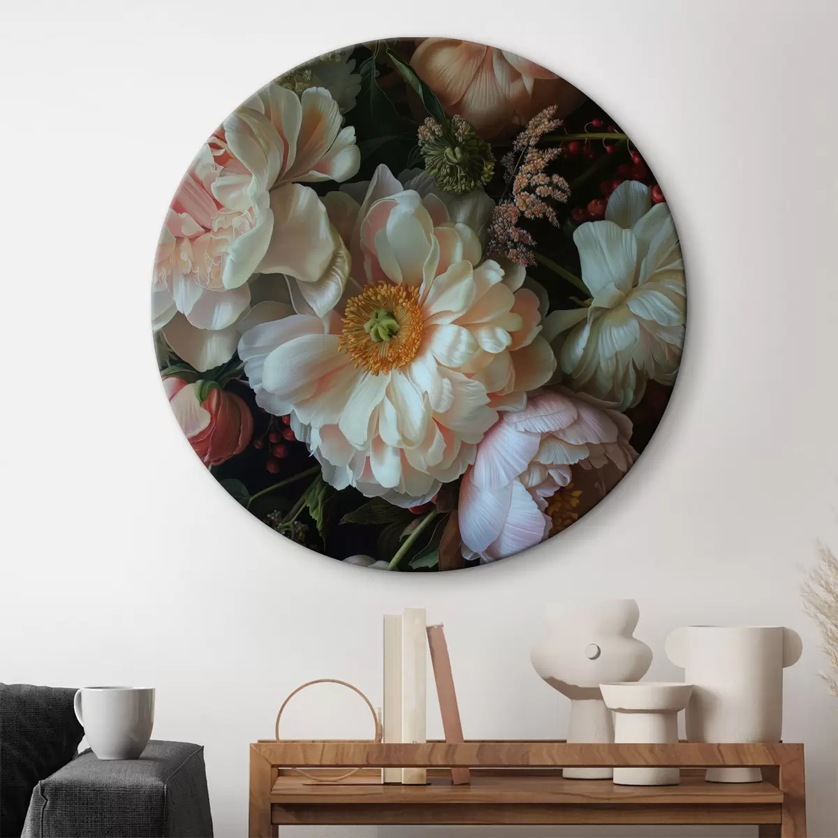 Ronde schilderijen Close-up van een boeket met zachtroze pioenrozen en zachtgroene bladeren Nr r39450