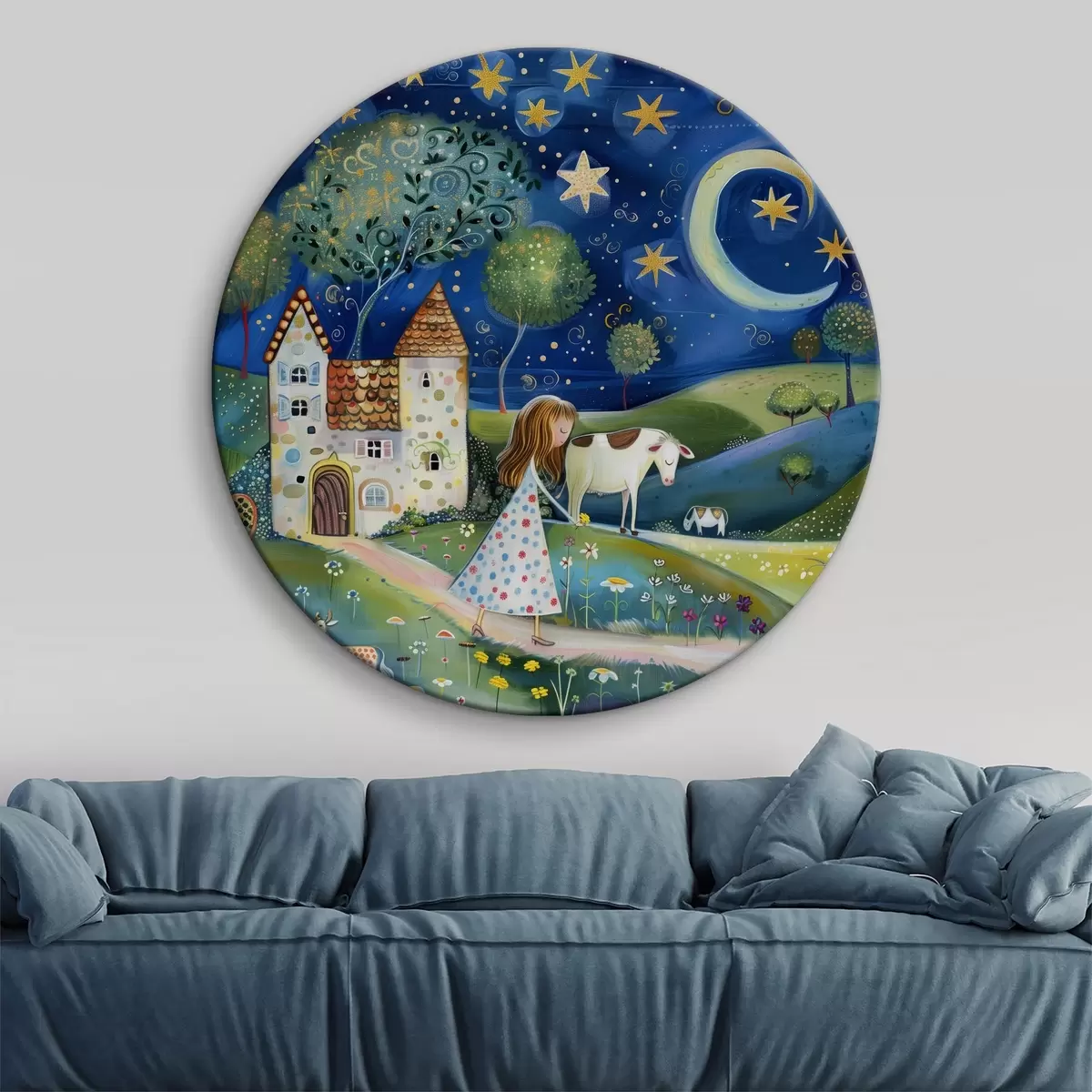 Ronde schilderijen Een kleine prinses, hond, koe en fantasiehuis onder de sterren in een grillige naïeve kunststijl Nr r39451