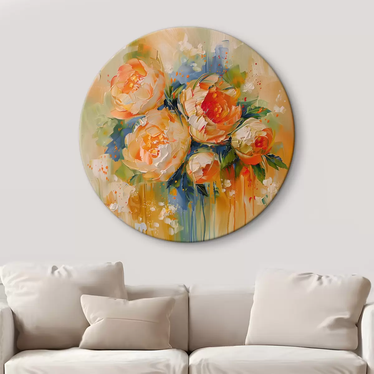 Ronde schilderijen Delicaat en levendig bloemstuk op een dynamische abstracte achtergrond Nr r39459