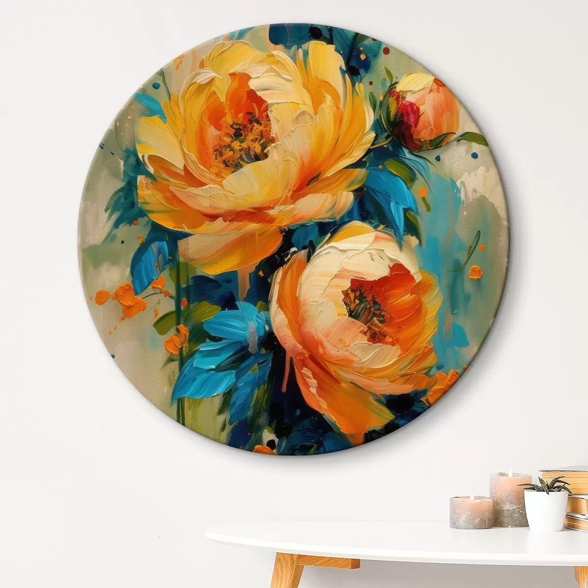 Ronde schilderijen Abstract schilderij in beige, gele, blauwe, saliegroene tinten met oranje spatten, levendige pioenrozen in de zomer Nr r39472