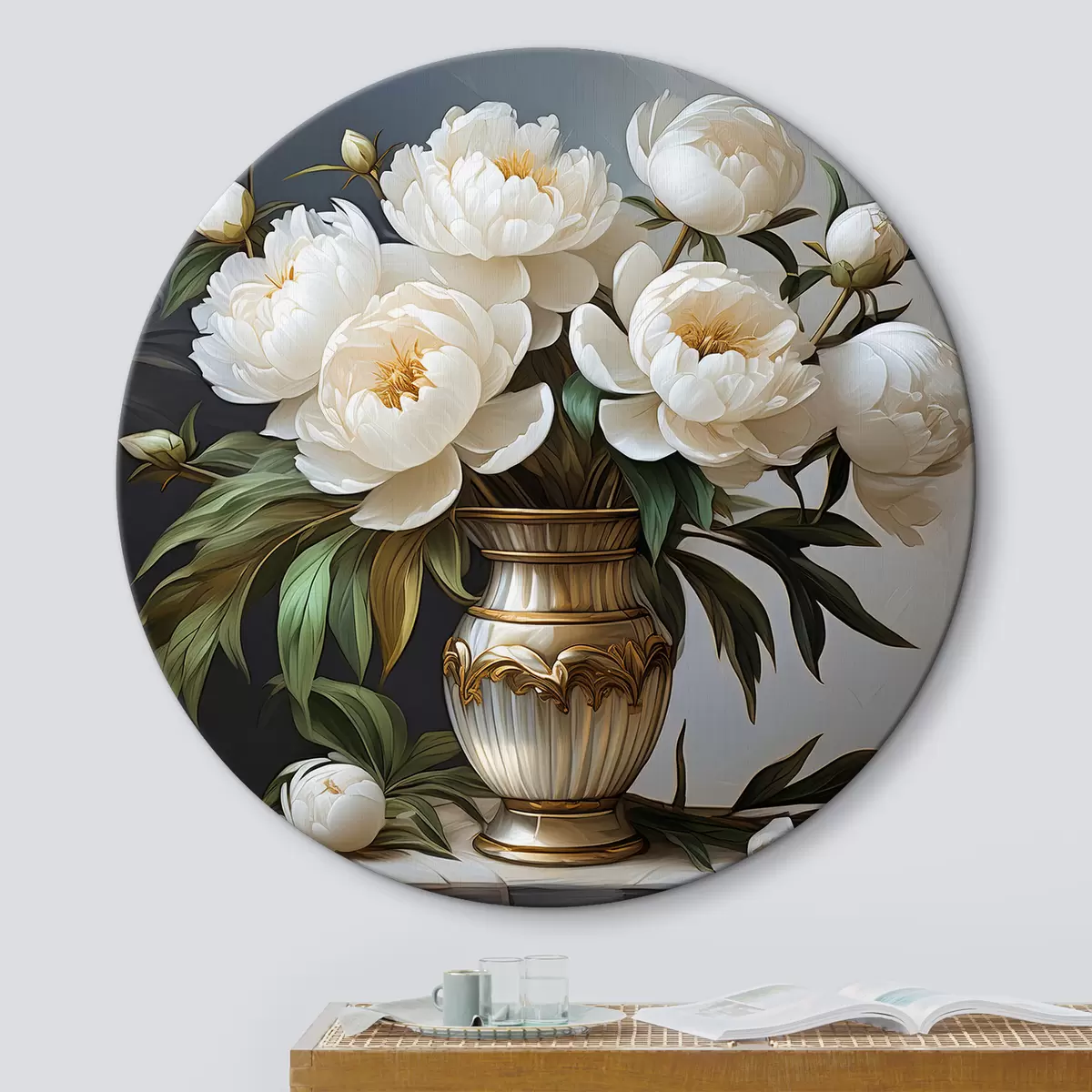 Ronde schilderijen Een boeket witte pioenrozen r39475