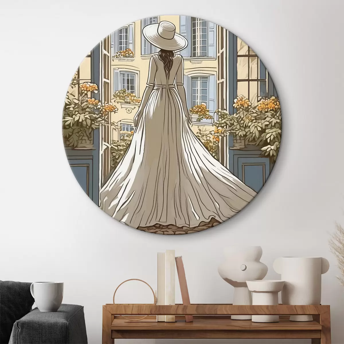Ronde schilderijen silhouet van een meisje in een witte jurk bij het raam r39479