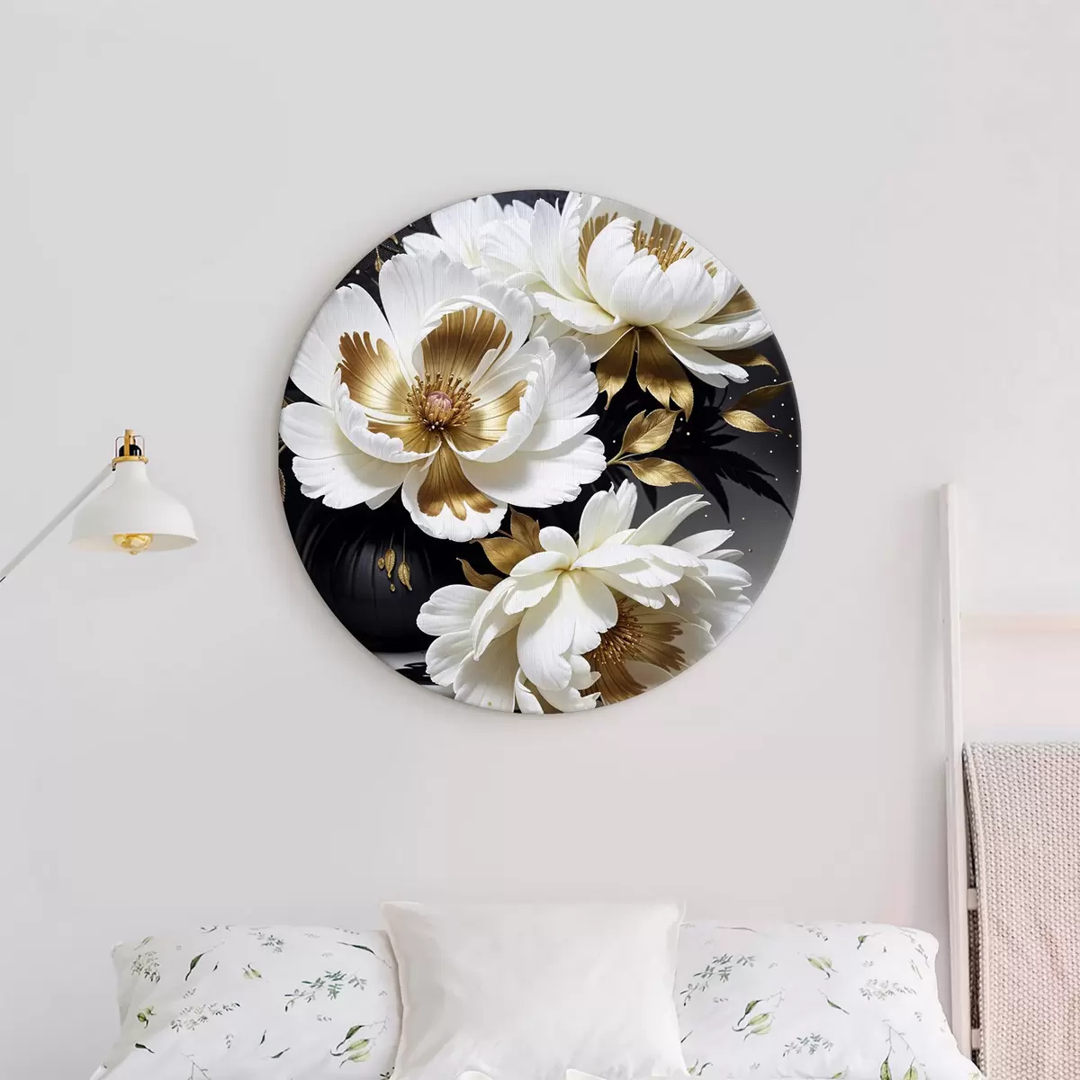 Ronde schilderijen Witte pioenbloemen in volle bloei, met donkere achtergrond Nr r39504