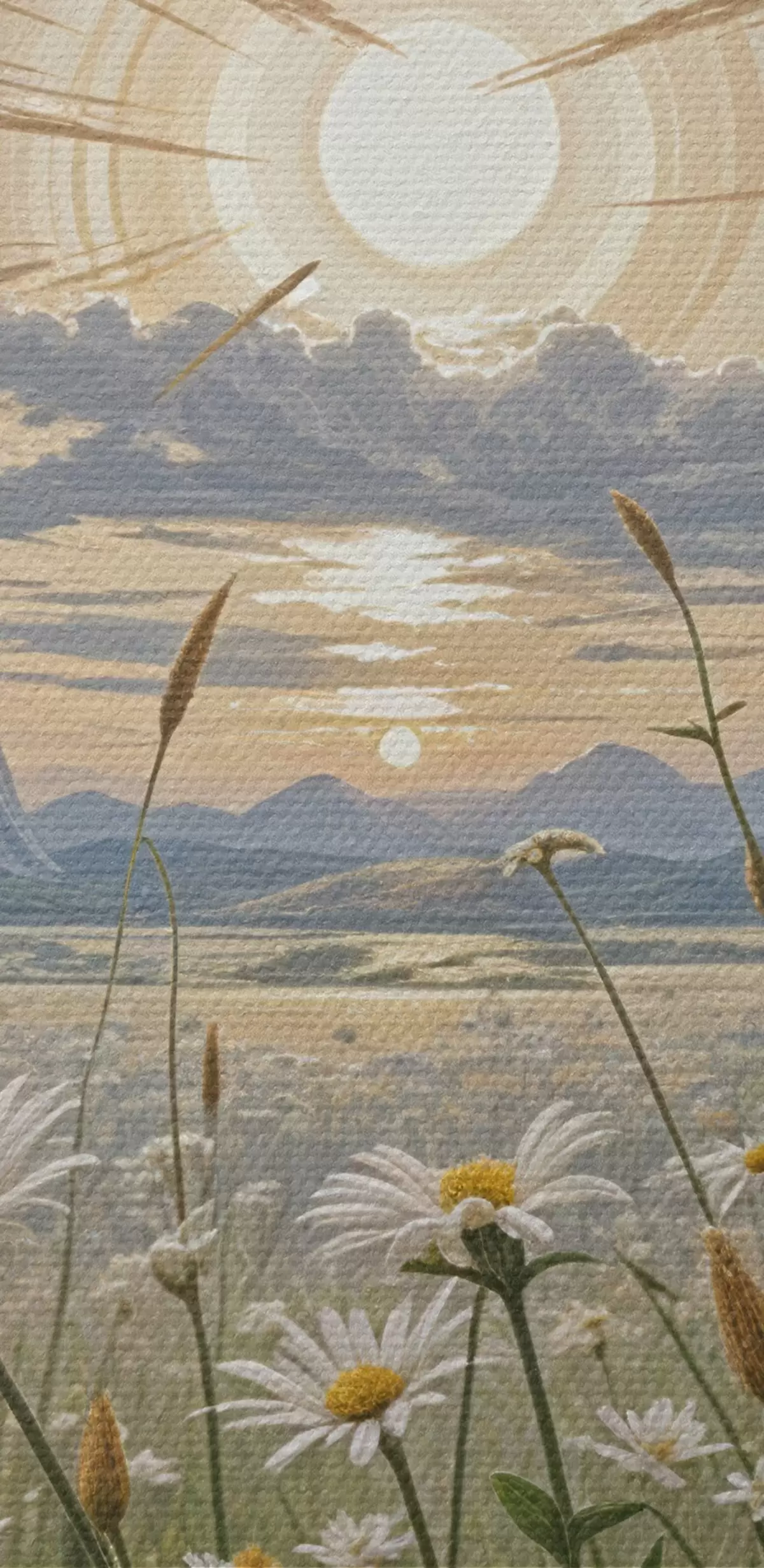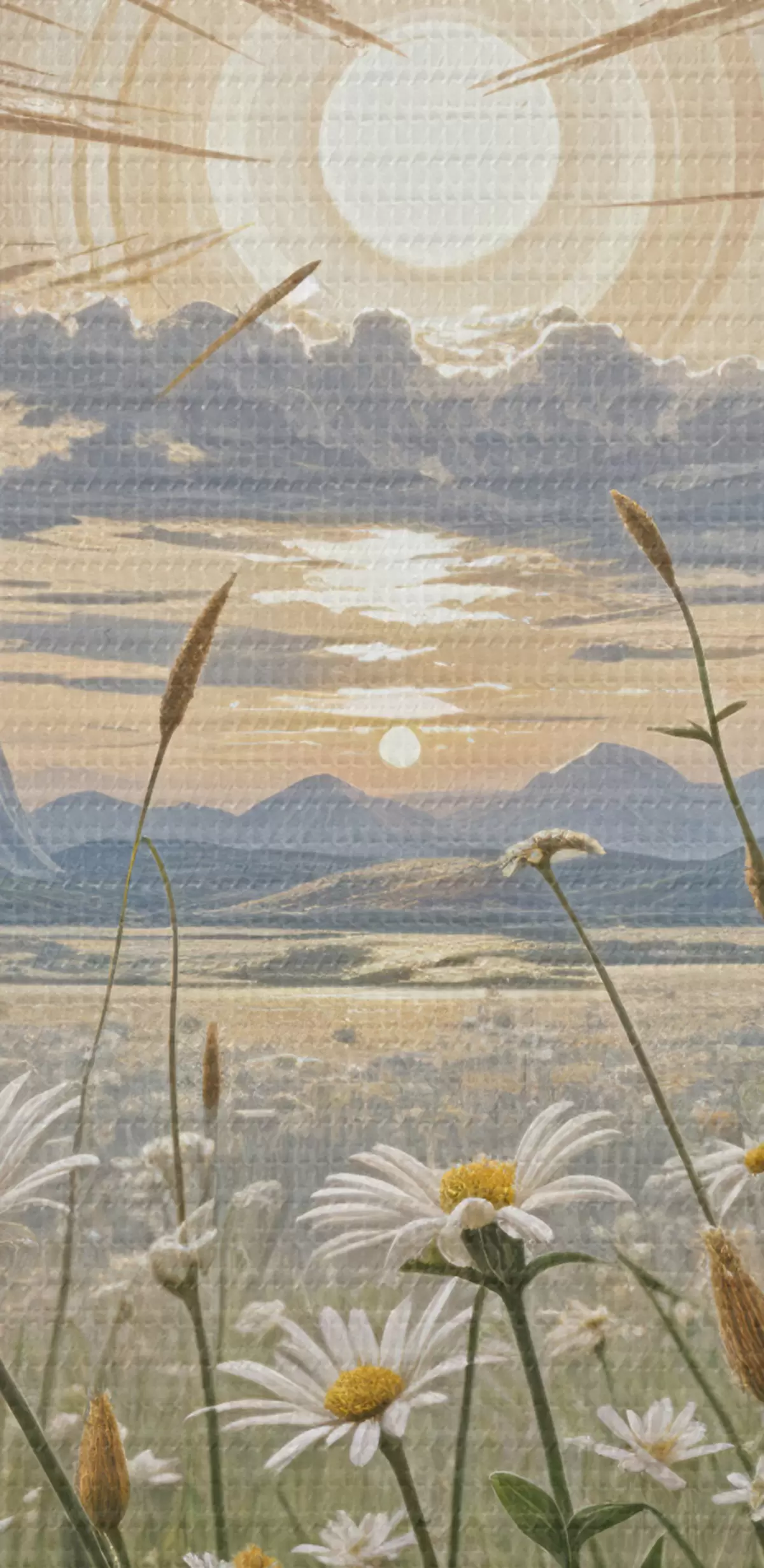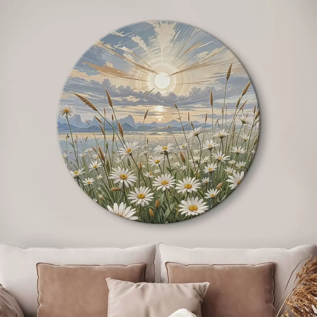Ronde schilderijen Een veld met witte margrietbloemen op de voorgrond met een landschap van bergen en een bewolkte hemel Nr r39528
