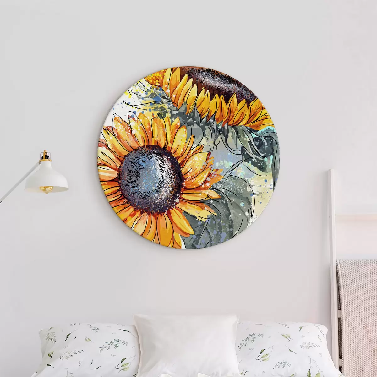 Ronde schilderijen Heldere zonnebloemen, aquareleffect met verfspatten Nr r39585
