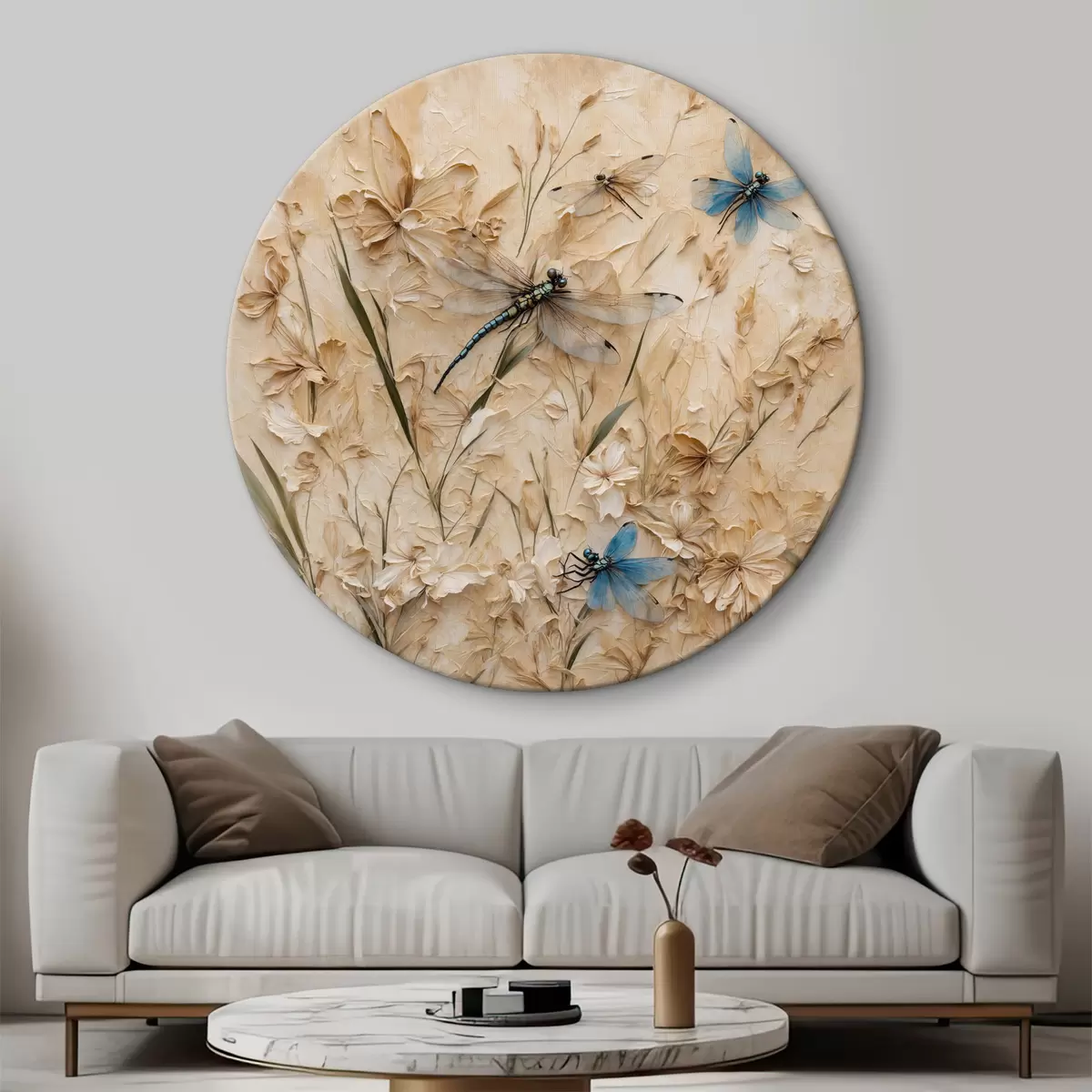 Ronde schilderijen Libellen op abstracte beige achtergrond Nr r39600