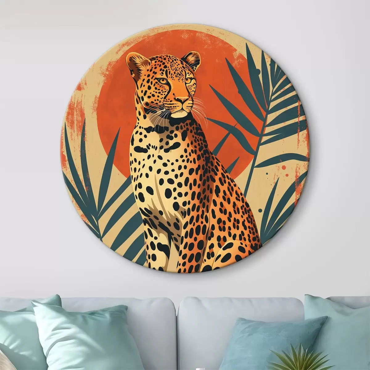 Ronde schilderijen Leopard's stare: een gedurfde compositie met zomerse palmbladeren op een levendig rode achtergrond Nr r39635
