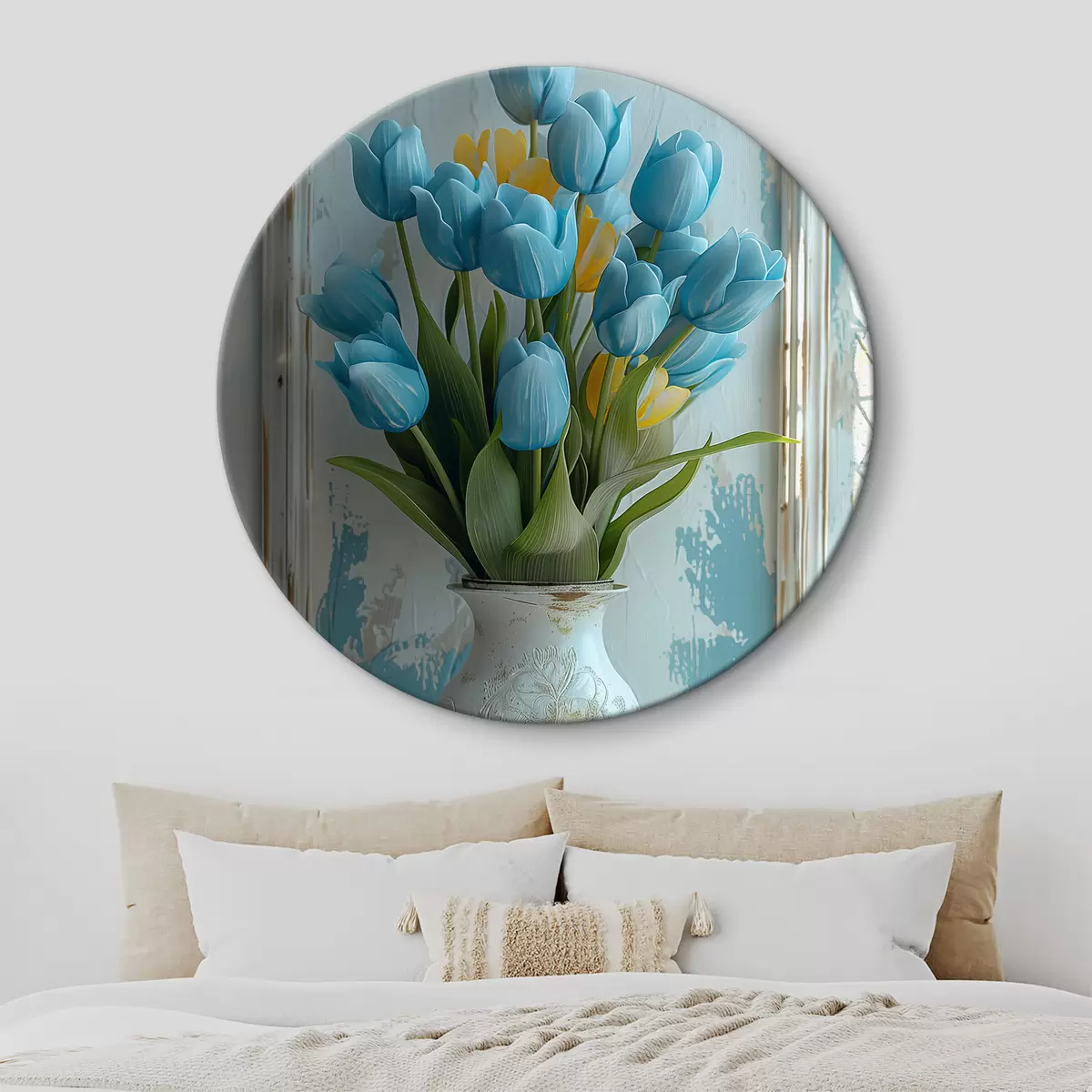 Ronde schilderijen Blauwe en gele tulpen in 3D: elegante wandfoto met witte lijst, witte en lichtblauwe achtergrond en gegraveerde vaas Nr r39636