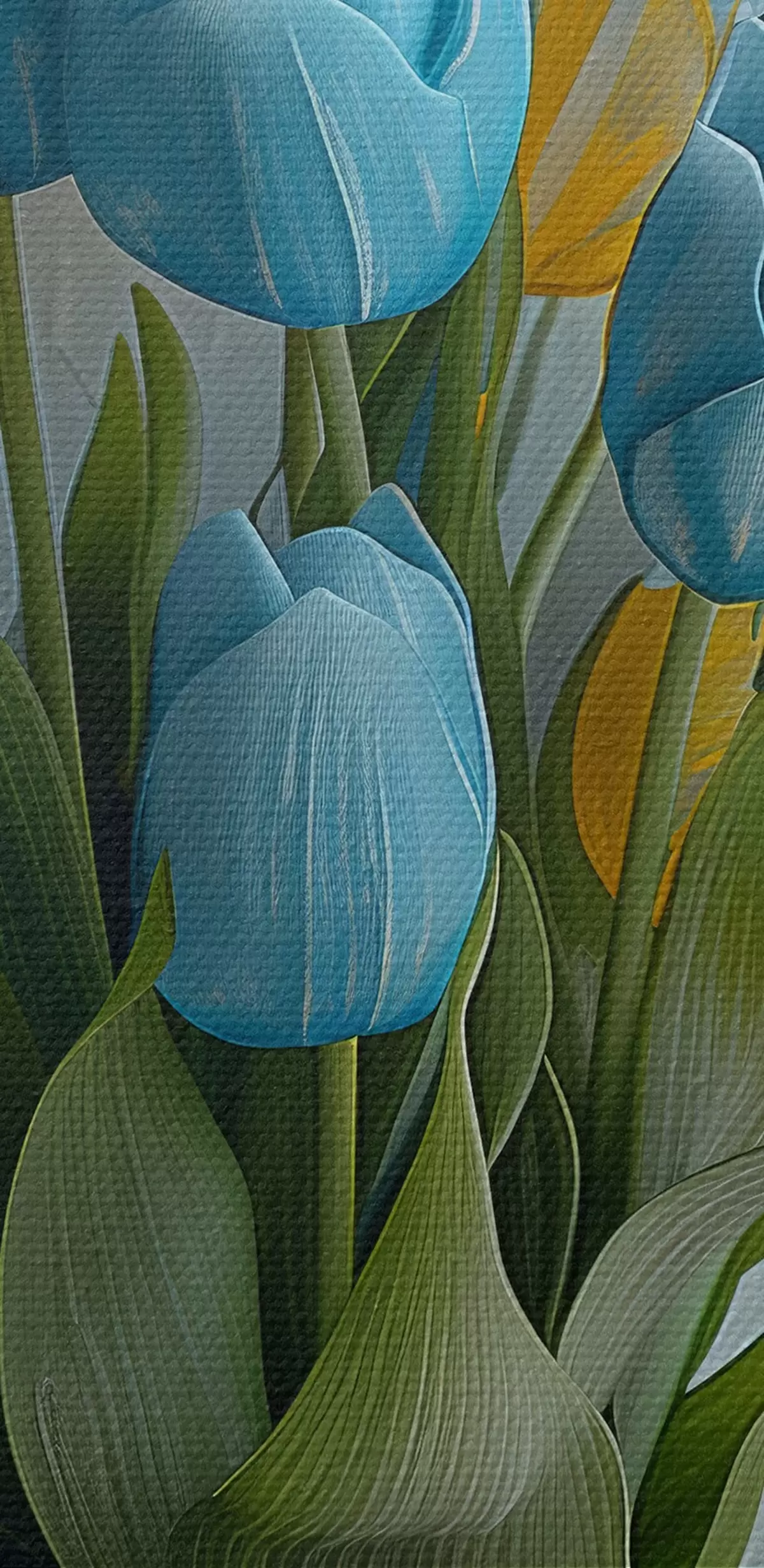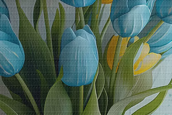 Ronde schilderijen Blauwe en gele tulpen in 3D: elegante wandfoto met witte lijst, witte en lichtblauwe achtergrond en gegraveerde vaas r39636