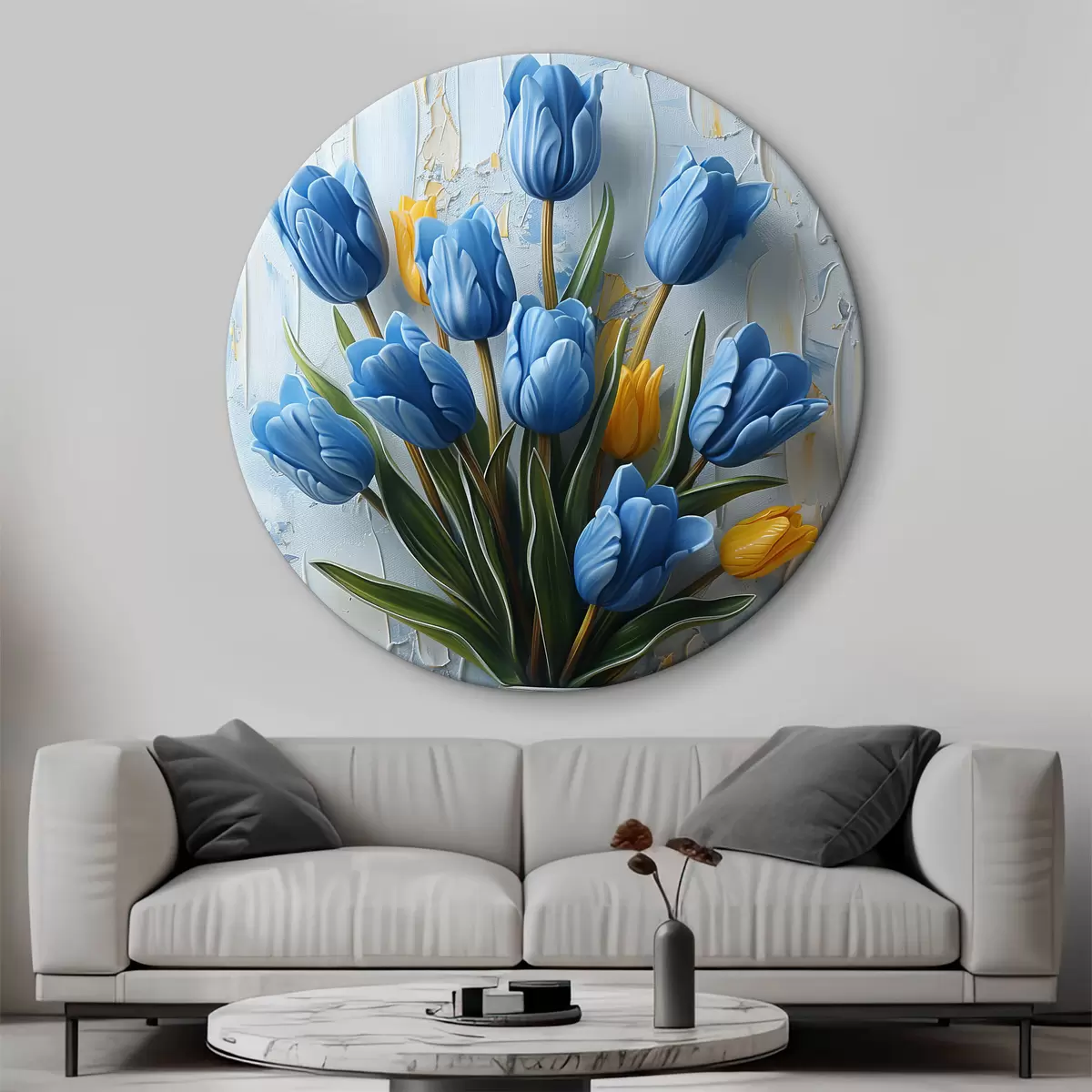 Ronde schilderijen Blauwe en gele tulpen in 3D: elegante olieverfschilderij met witte en lichtblauwe achtergrond en gegraveerde vaas Nr r39637