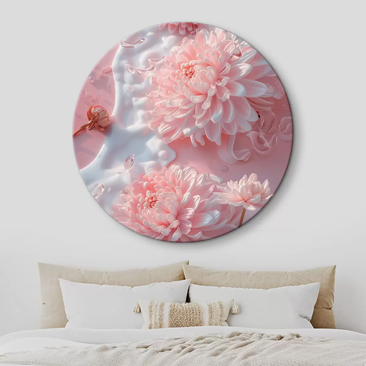 Ronde schilderijen Chrysantencompositie: enkele bloemen met een scheutje melk op een roze achtergrond r39640