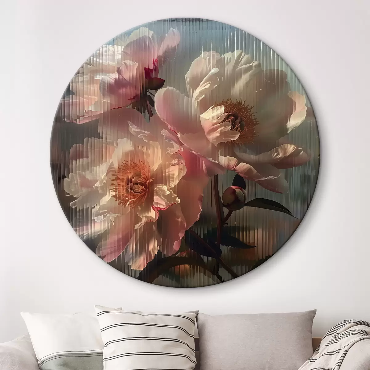 Ronde schilderijen Roze pioenrozen door golfglas: een fotorealistische close-up met beeldbreking r39647