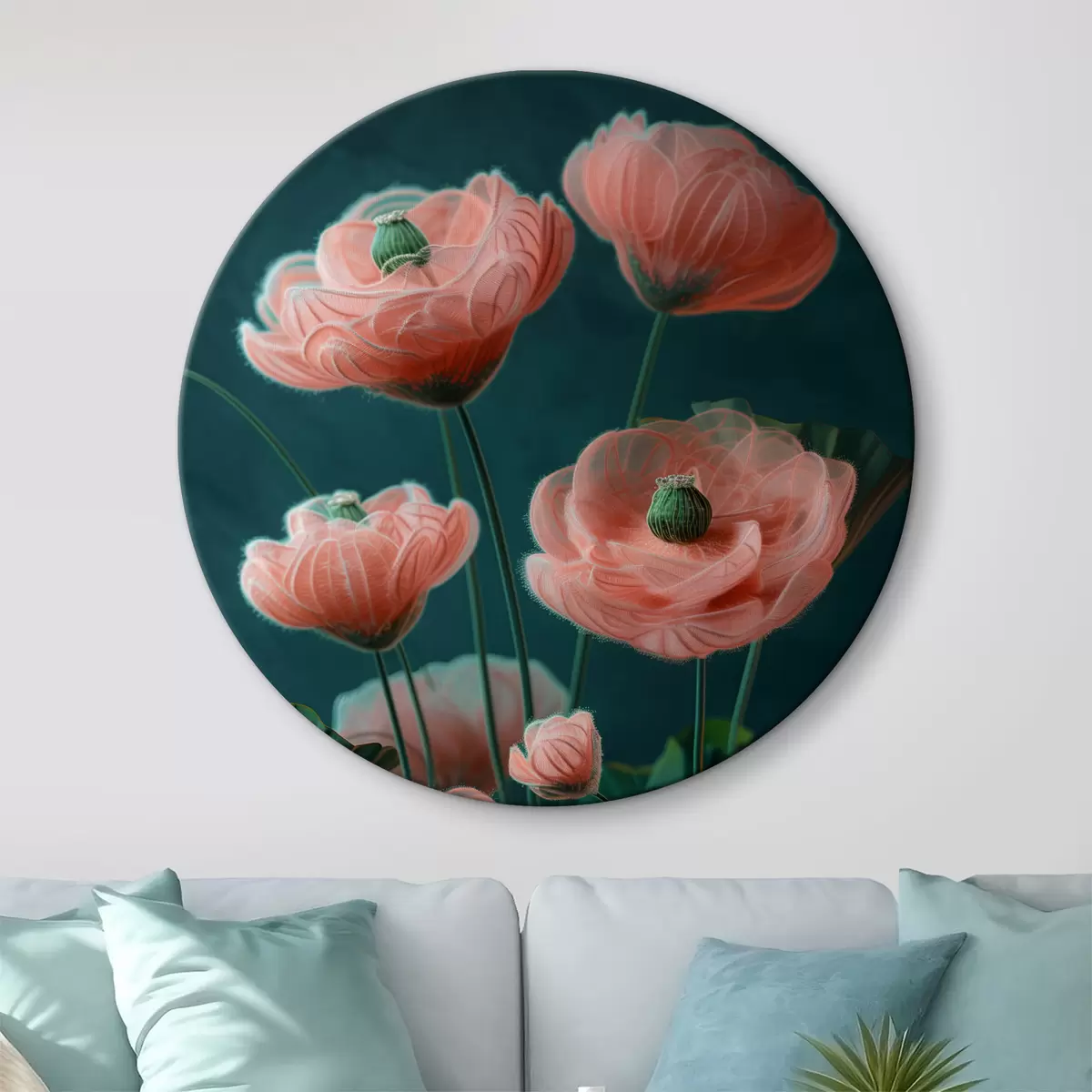 Ronde schilderijen Harige gigantische roze bloemen gemaakt van wol op een groene achtergrond Nr r39651
