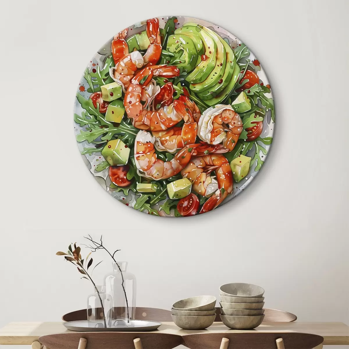 Ronde schilderijen Salade met avocado en garnalen, heerlijk, food art, aquarel, zomerkleuren Nr r39696
