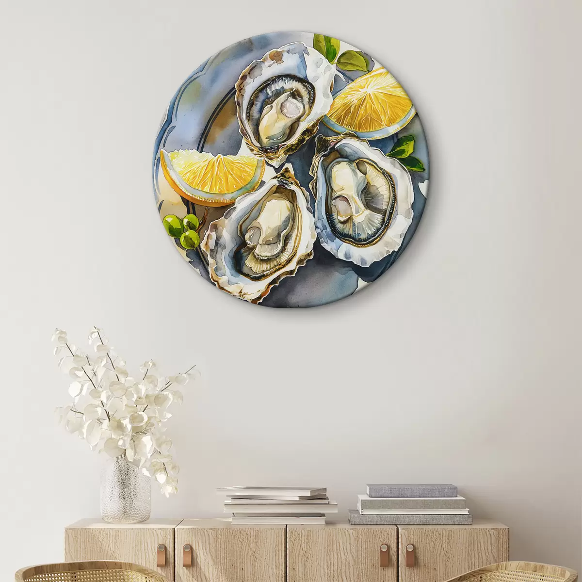 Ronde schilderijen Elegante oesters op het bord, aquarel, citroenen, natuurlijke kleuren, mediterraan Nr r39711