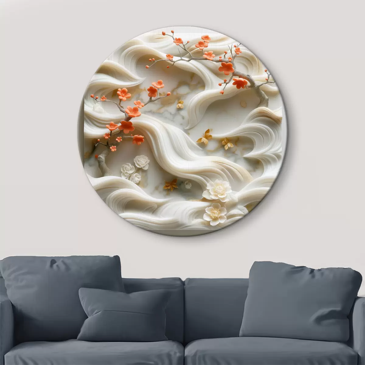 Ronde schilderijen Hemels 3D-tuintafereel gebeeldhouwd in wit marmeren bas-reliëf met vloeiende flora en fauna Nr r39730