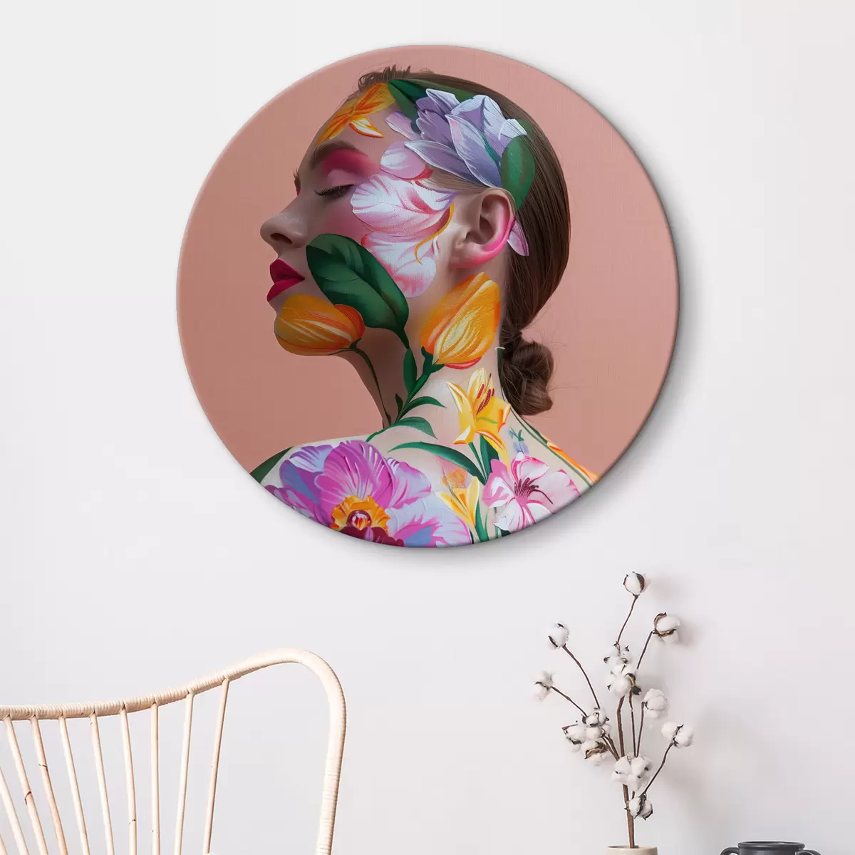 Ronde schilderijen Kleurrijke bloemverfmake-up op het lichaam van de vrouw r39732