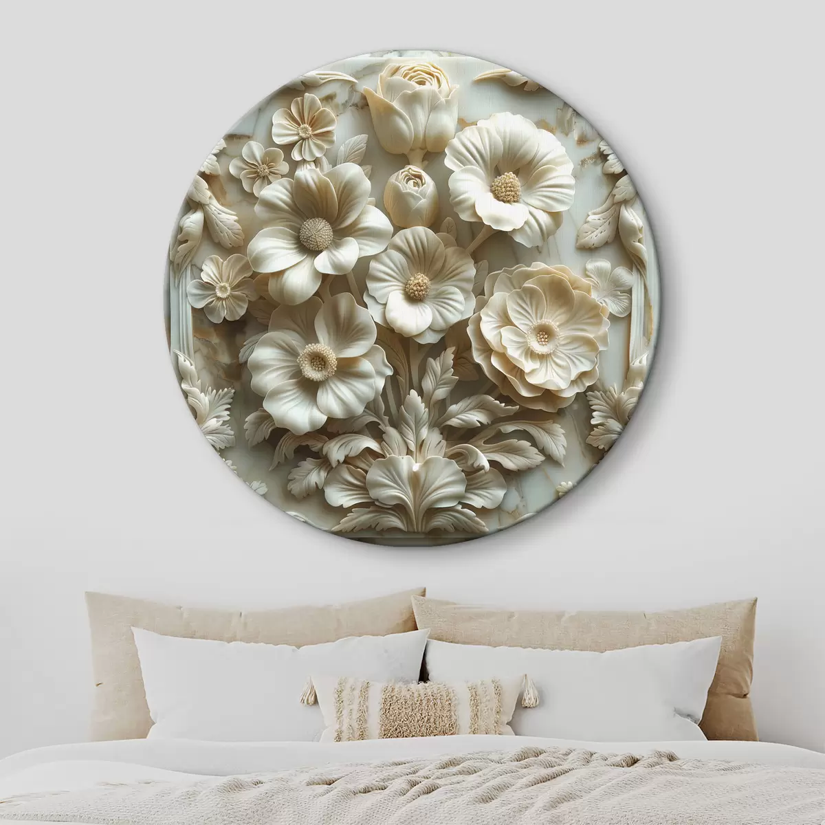 Ronde schilderijen 3d witte bas-reliëf bloemen op een marmeren achtergrond met een kader r39739