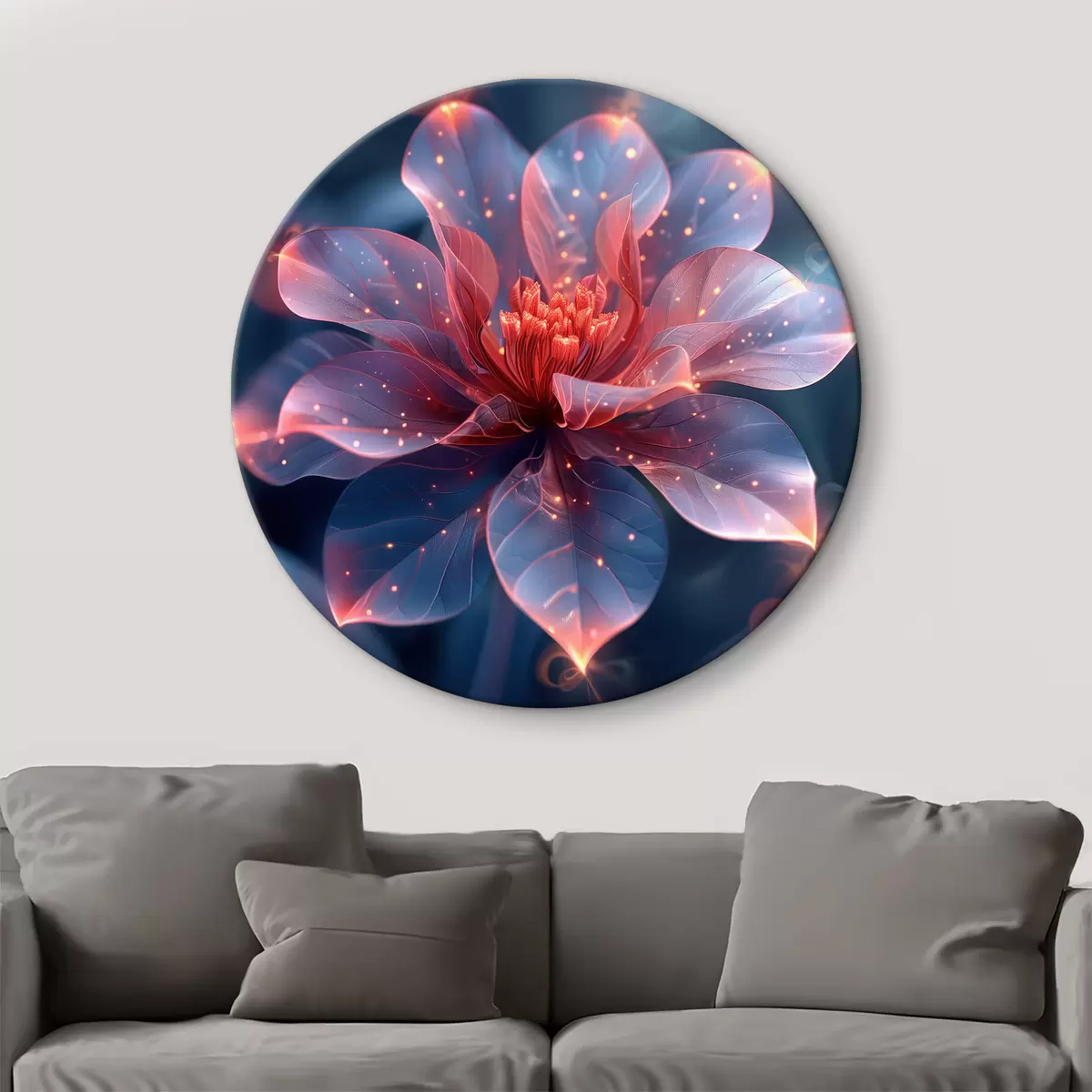 Ronde schilderijen Leuke grote fractal bloem in blauw en rood met gloeiende bloemblaadjes Nr r39741