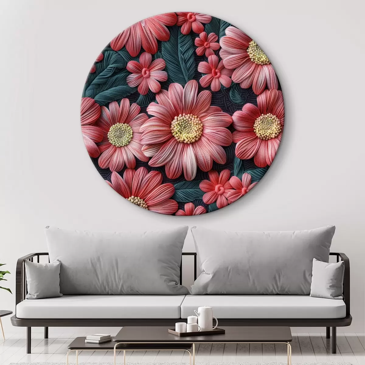 Ronde schilderijen 3D-borduurwerk van roze gerbera's van wolgaren op een gewatteerde achtergrond r39746