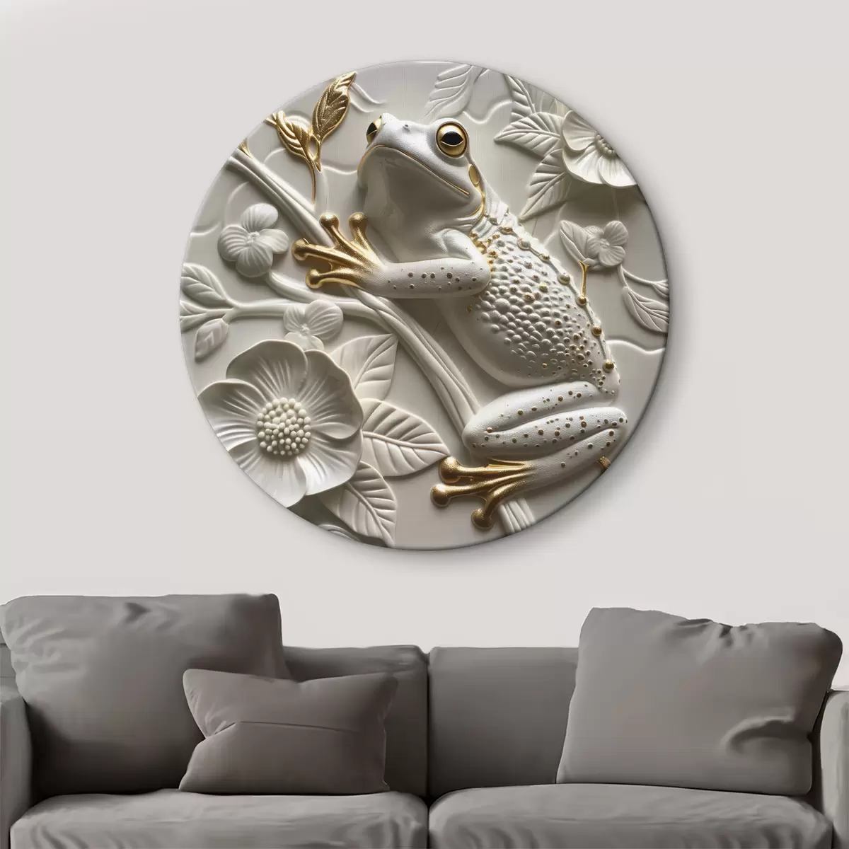 Ronde schilderijen Sculptuur met boomkikker en bloemenpatroon Nr r39750