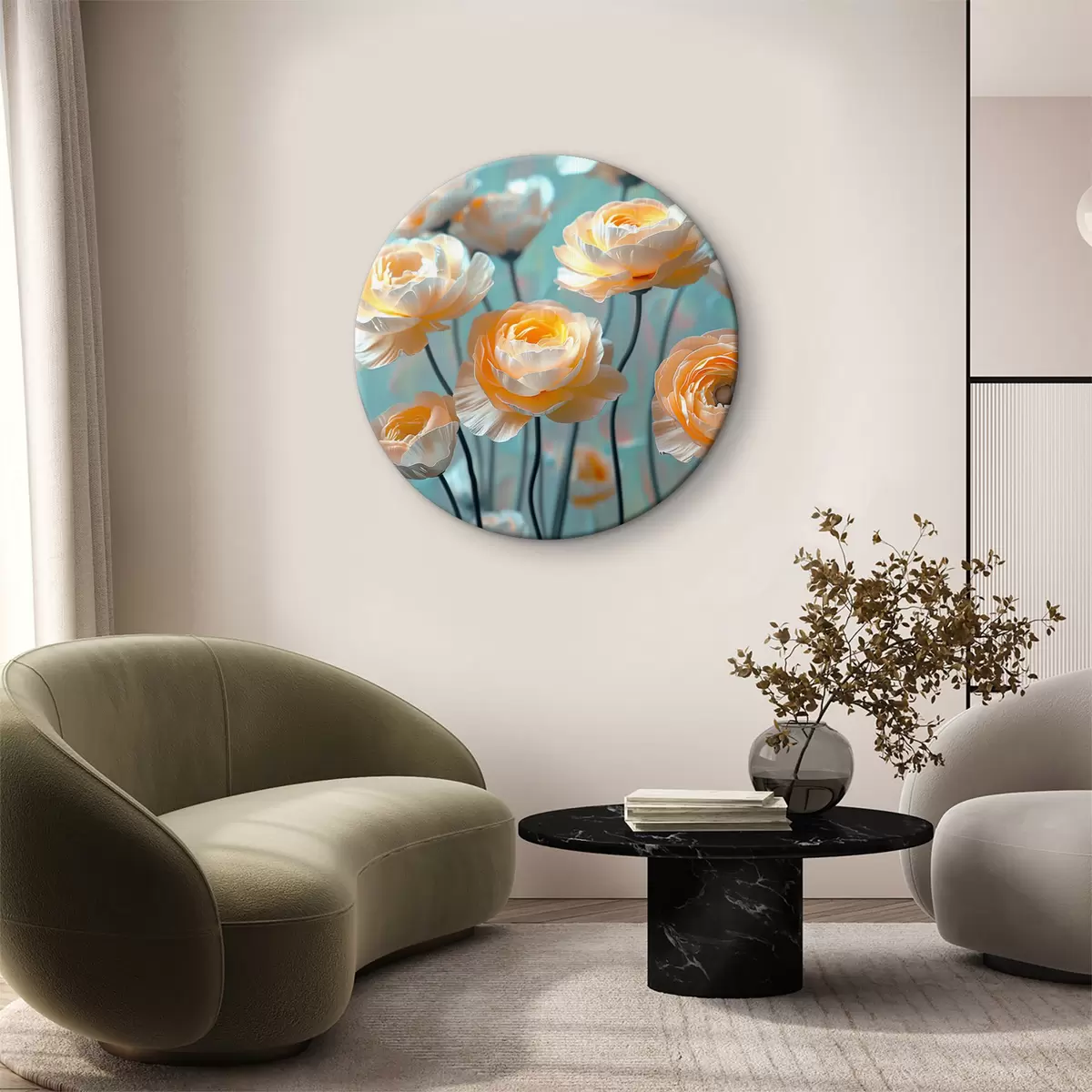 Ronde schilderijen Fijne witte en oranje pioenrozen op een blauwe achtergrond Nr r39753