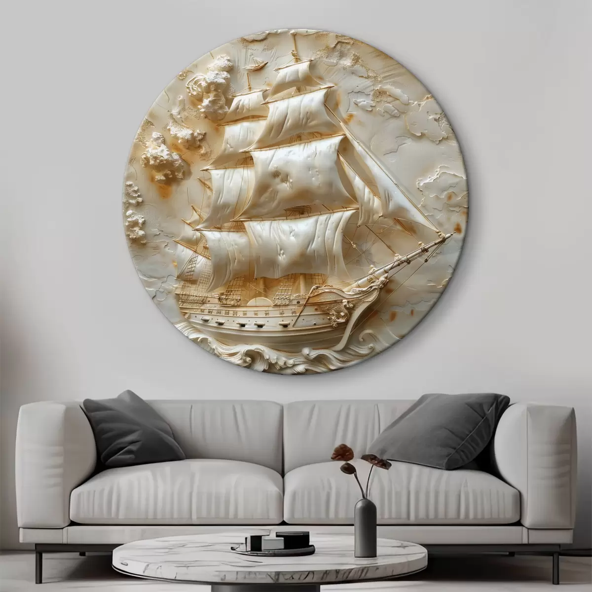 Ronde schilderijen Bas-reliëf van een schip dat op zee vaart Nr r39757