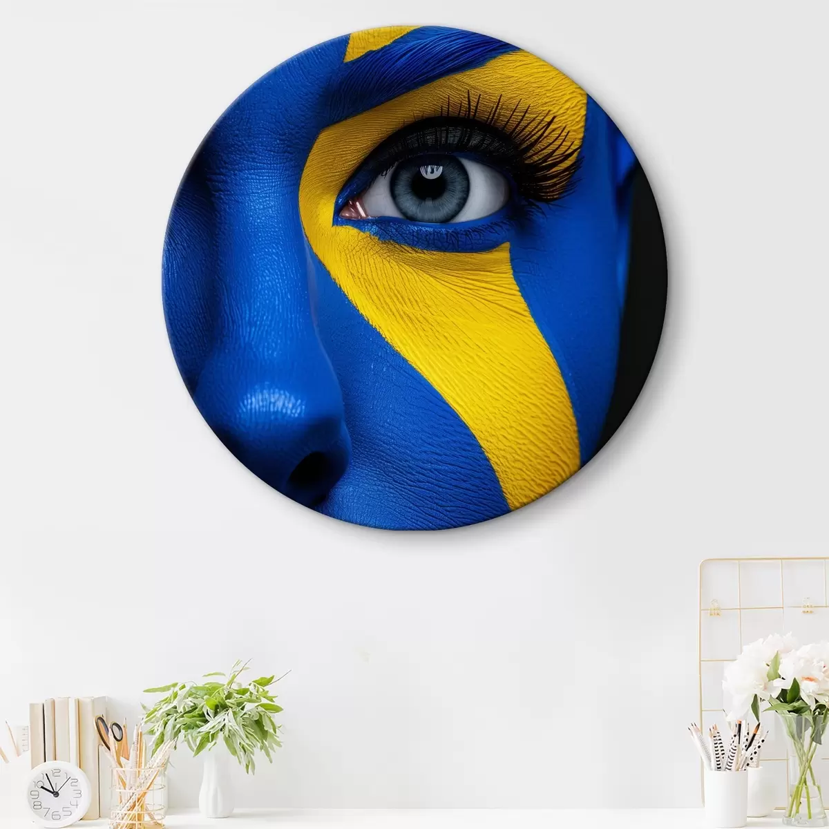 Ronde schilderijen Heldergeel en blauw minimalistisch portret van een mooi meisje Nr r39758