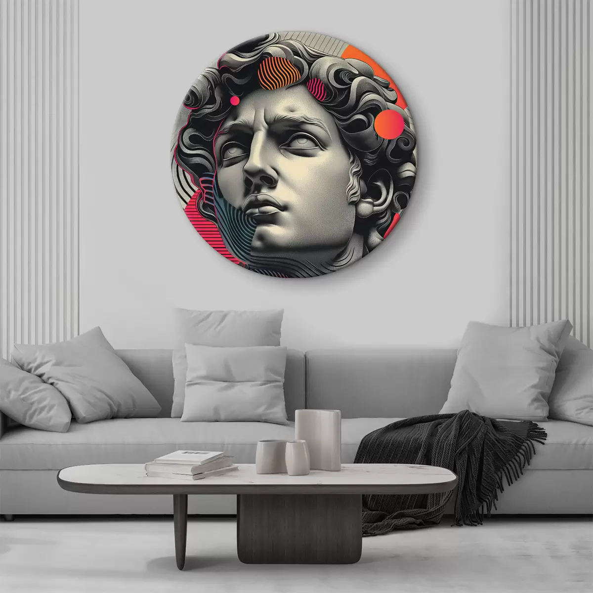 Ronde schilderijen Zwart-witte Apollo met gekleurde vlekken in grafische stijl r39762