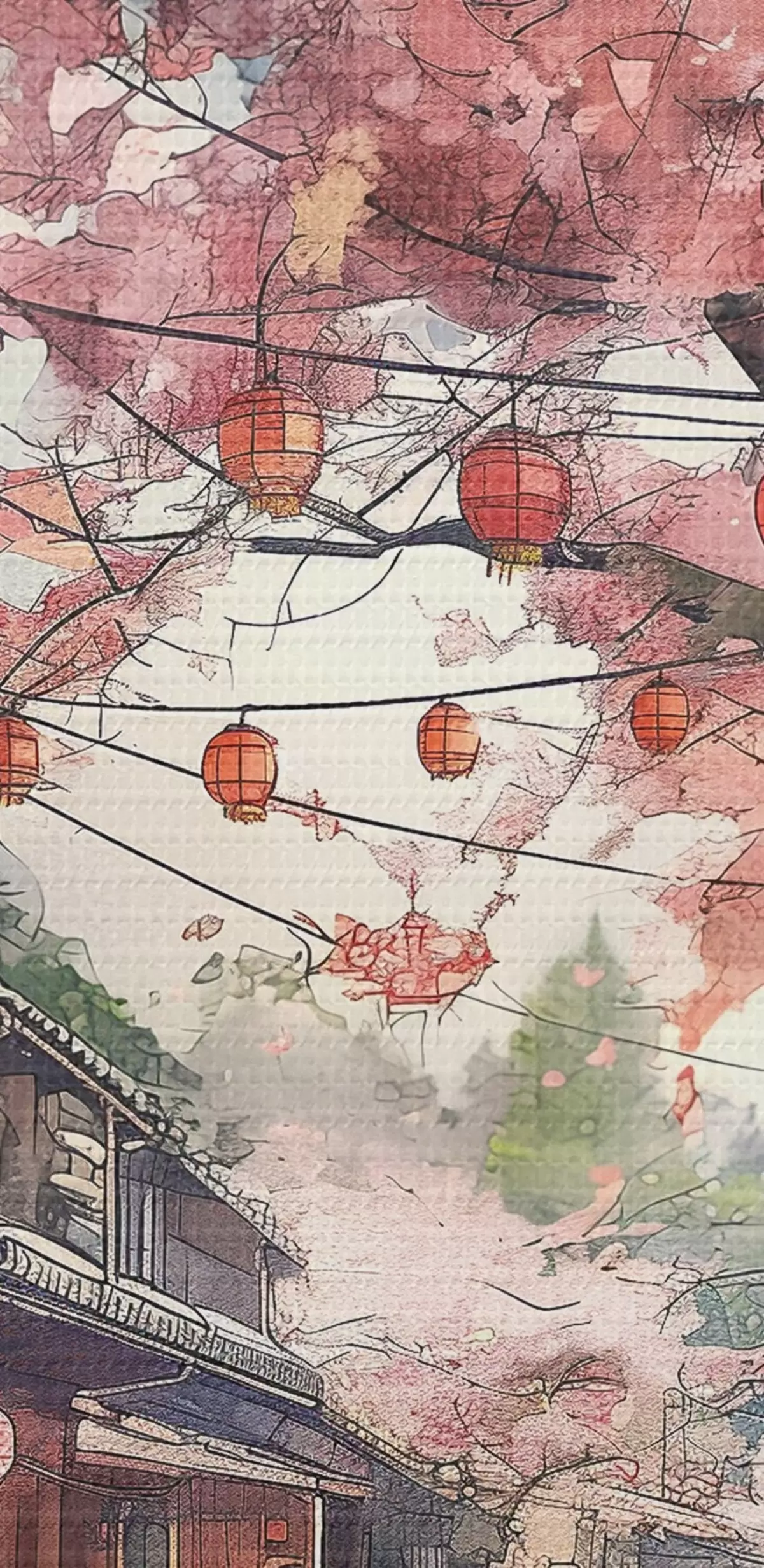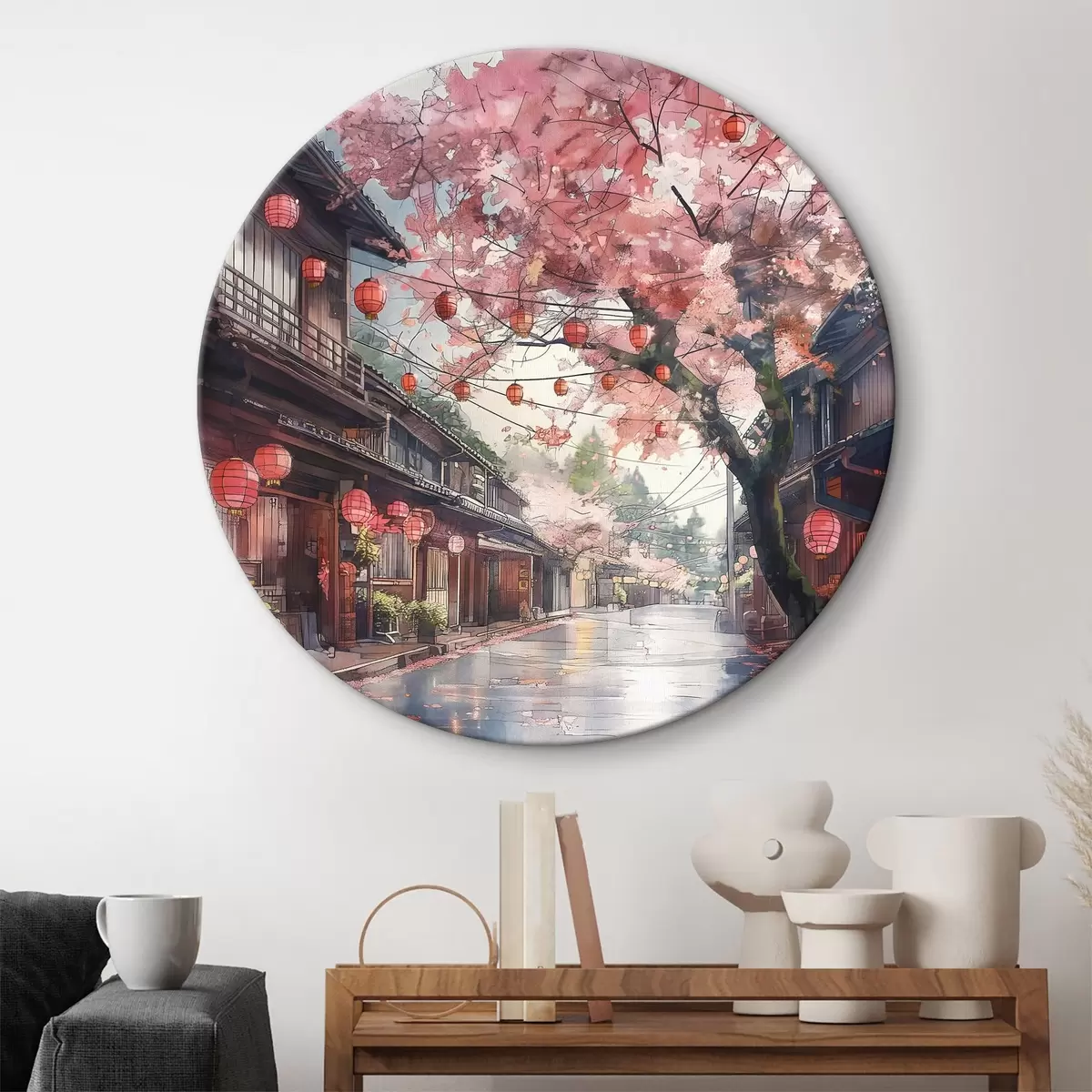 Ronde schilderijen Japanse straat met bloeiende kersenbomen, oosterse architectuur, lantaarns r39774
