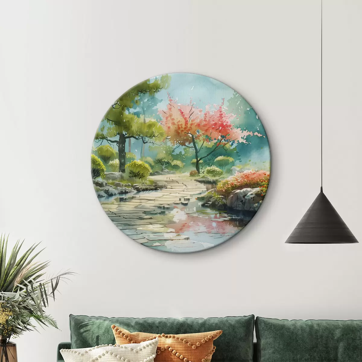 Ronde schilderijen Park met bomen en struiken met bloemen, kleine vijver, kersenboom Nr r39778