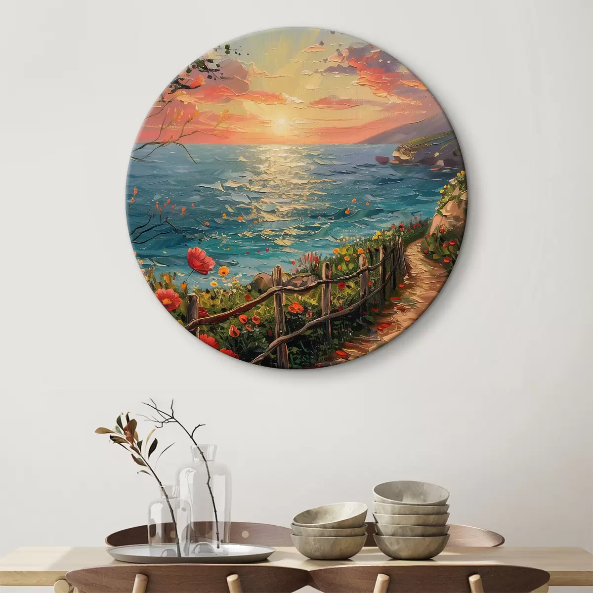 Ronde schilderijen Steegje van rode klaprozen aan het water Nr r39811