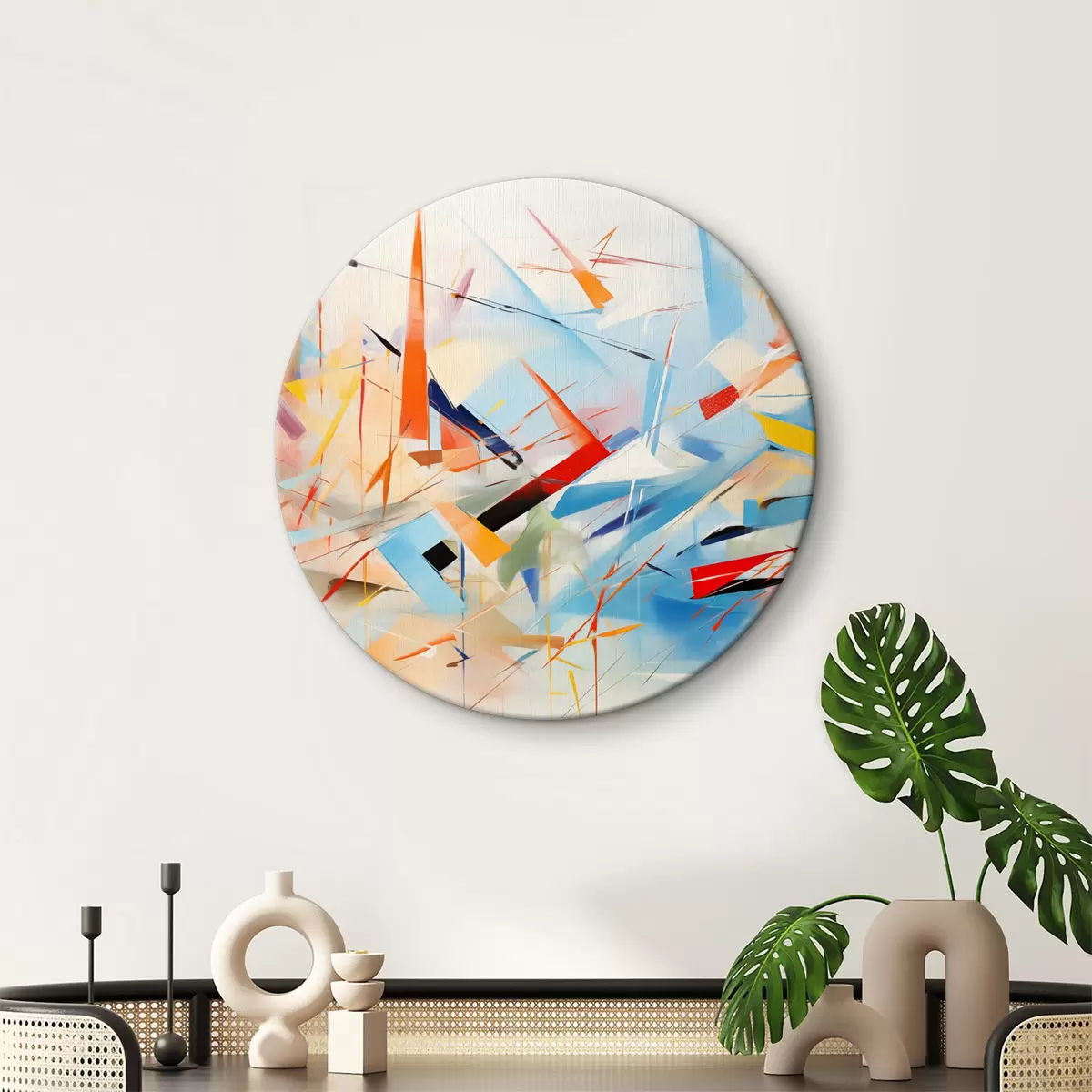 Ronde schilderijen Chaotische dynamische geometrische abstractie, blauw, rood, geel r39813