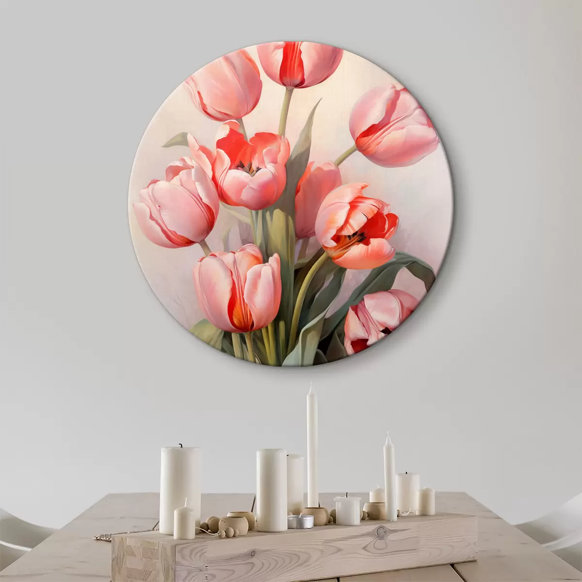 Ronde schilderijen Rozerode tulpen op licht olieverfschilderij Nr r39832