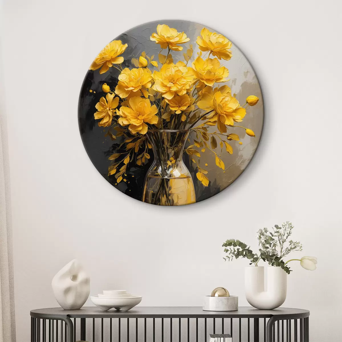 Ronde schilderijen Gele bloemen in transparante vaas op acrylachtergrond Nr r39853