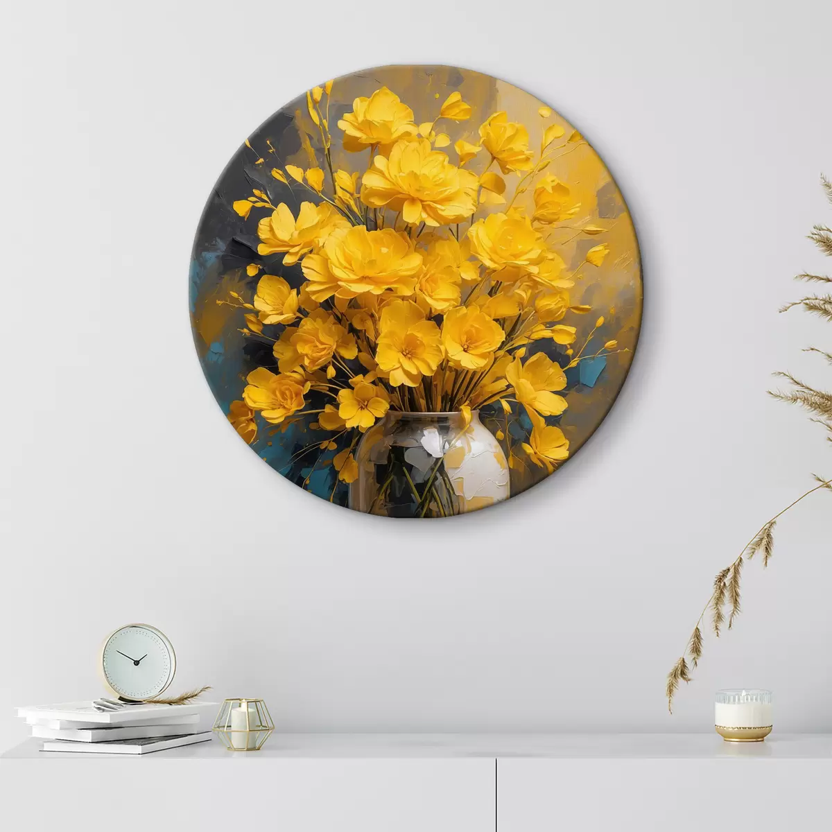 Ronde schilderijen Gele bloemen in vaas op veelkleurige acrylachtergrond Nr r39854