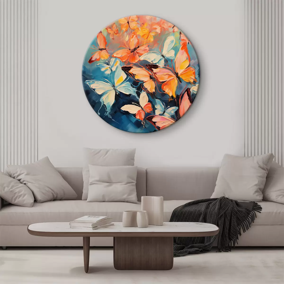 Ronde schilderijen Een zwerm vlinders vliegt op een blauw olieverfschilderij Nr r39922