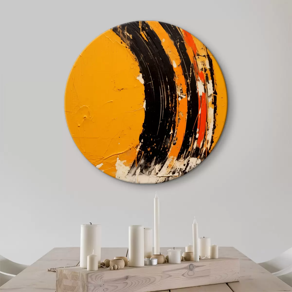 Ronde schilderijen Abstracte zwarte strepen op geel olieverfschilderij Nr r39923