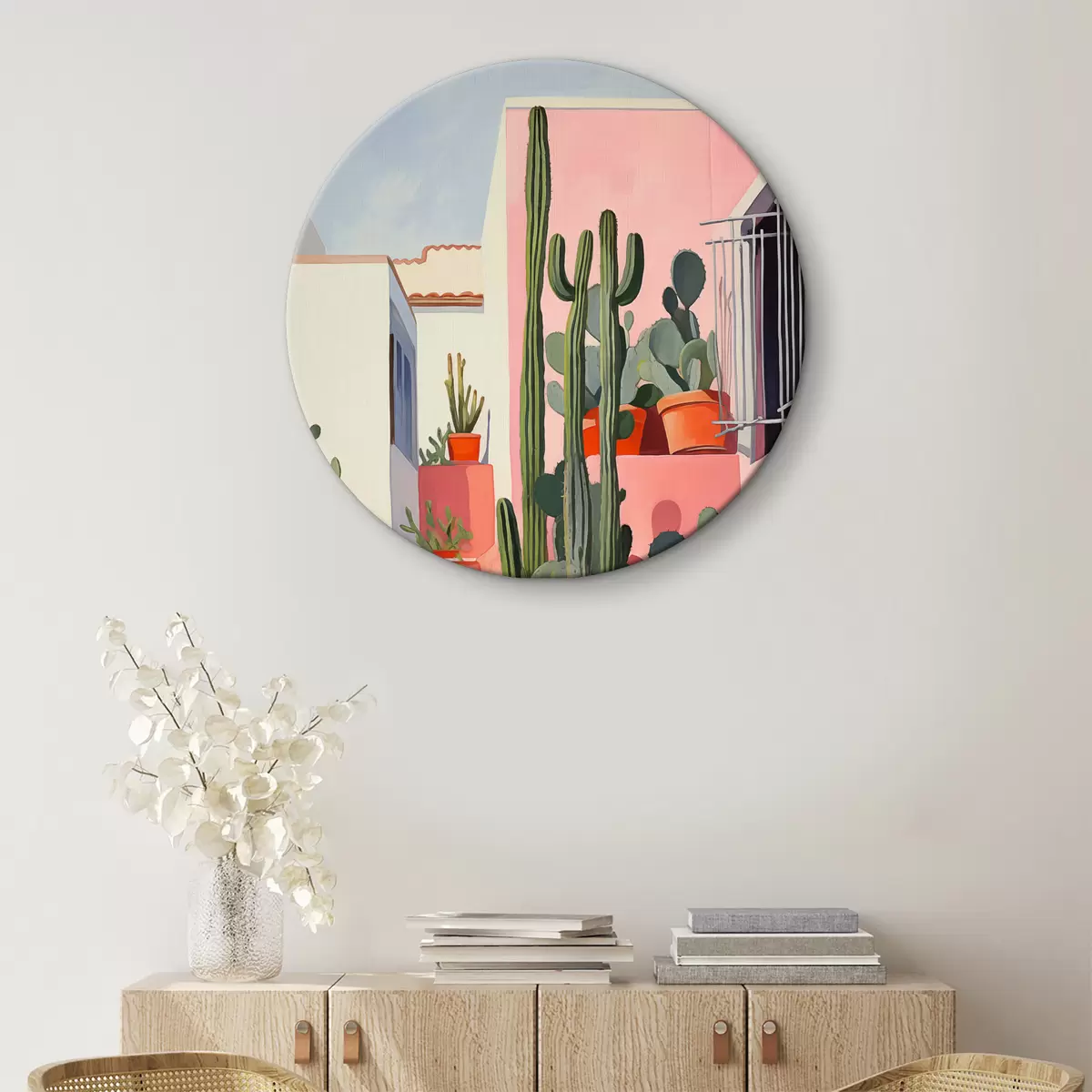 Ronde schilderijen Lange cactussen tegen de achtergrond van een roze huis en trappen olieverfschilderij Nr r39926