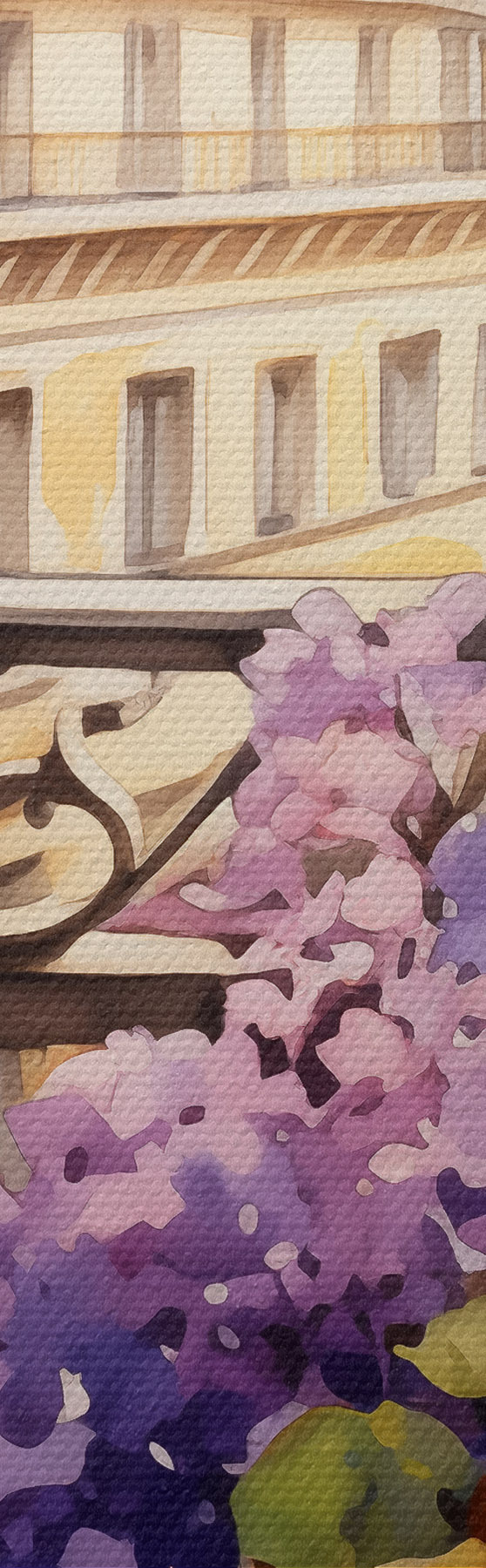 Ronde schilderijen Viooltjes in een pot op een balkon in Parijs aquarel r39931
