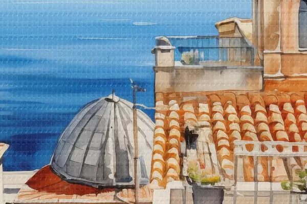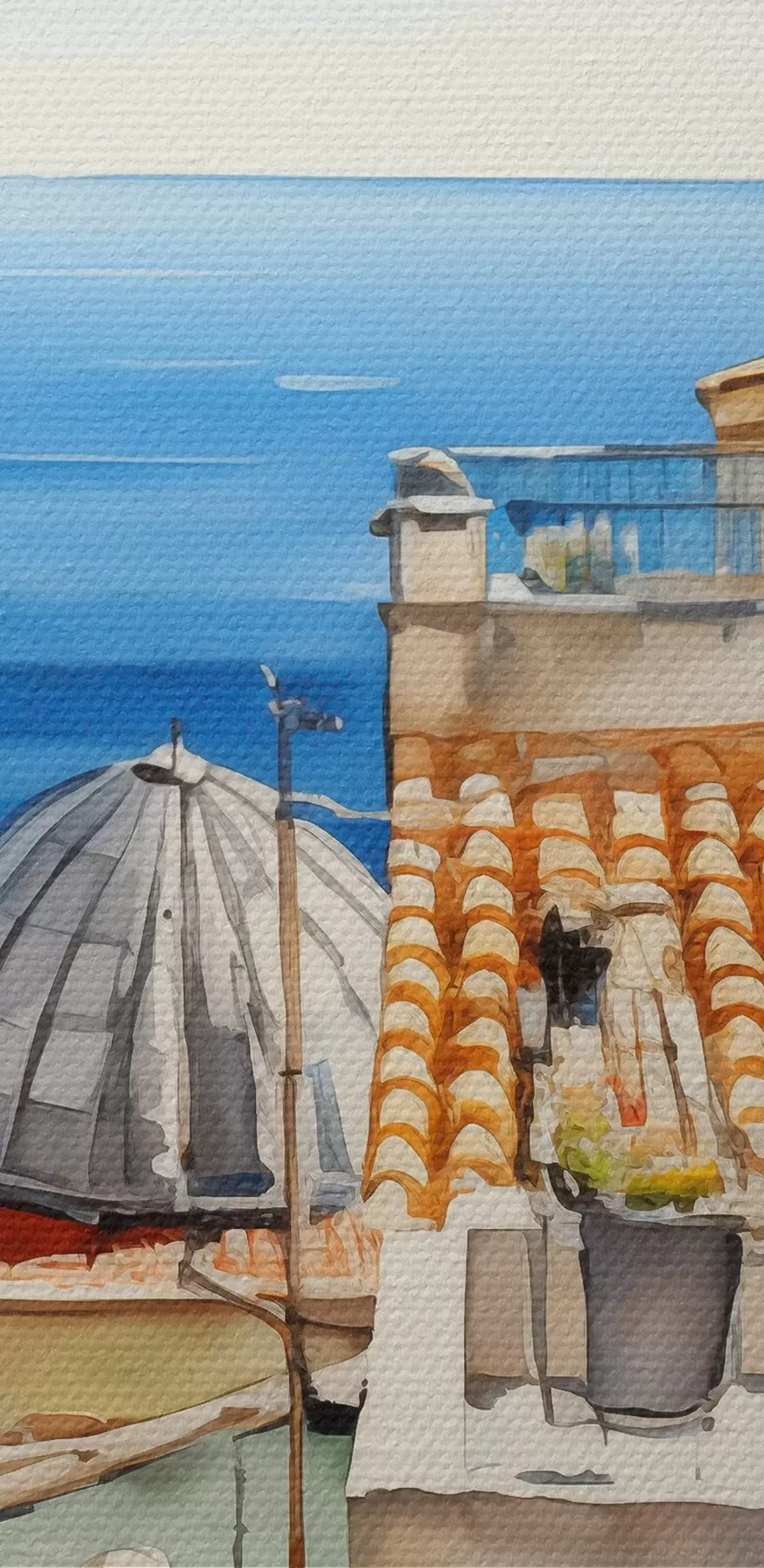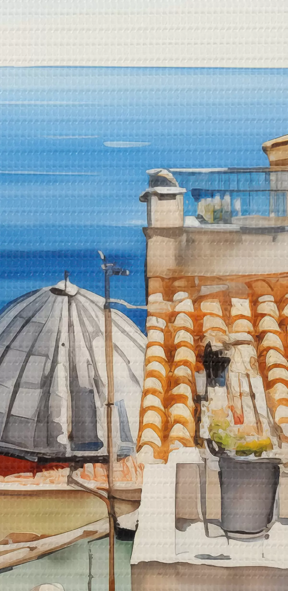 Ronde schilderijen Daken van Italiaanse huizen tegen de achtergrond van de zee en de lucht aquarel Nr r39933