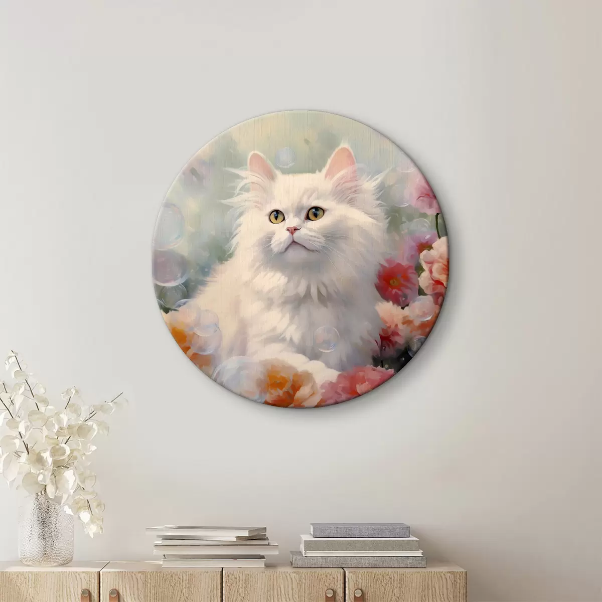 Ronde schilderijen Witte pluizige kat in een tuin met bloemen en zeepbellen aquarel Nr r39937