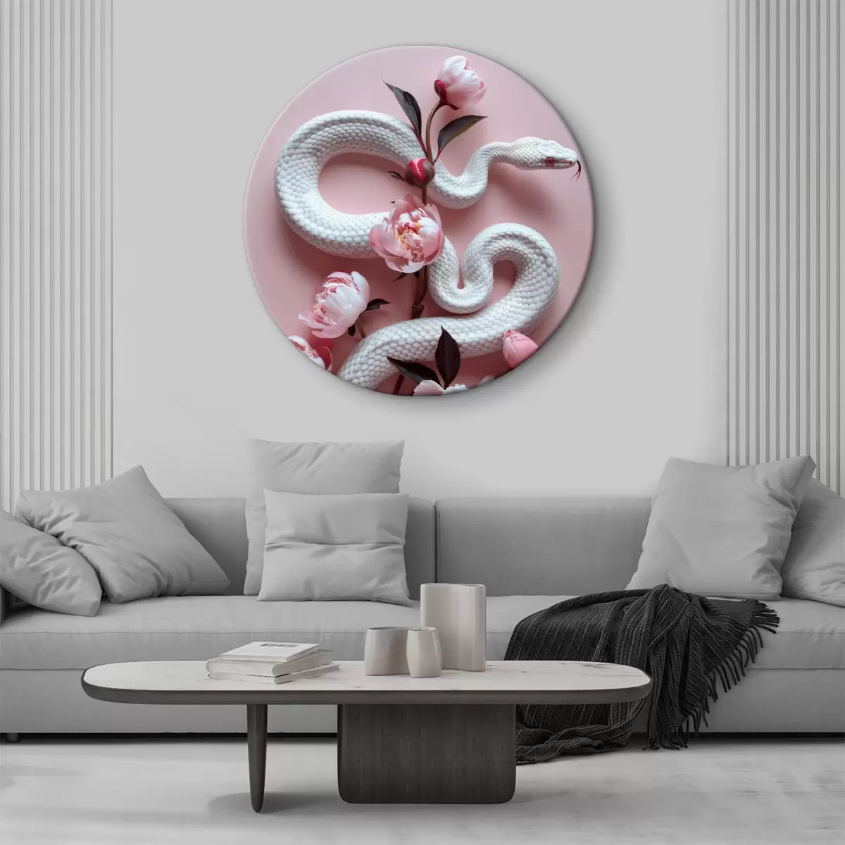 Ronde schilderijen Pioenrozen en witte slang r39942