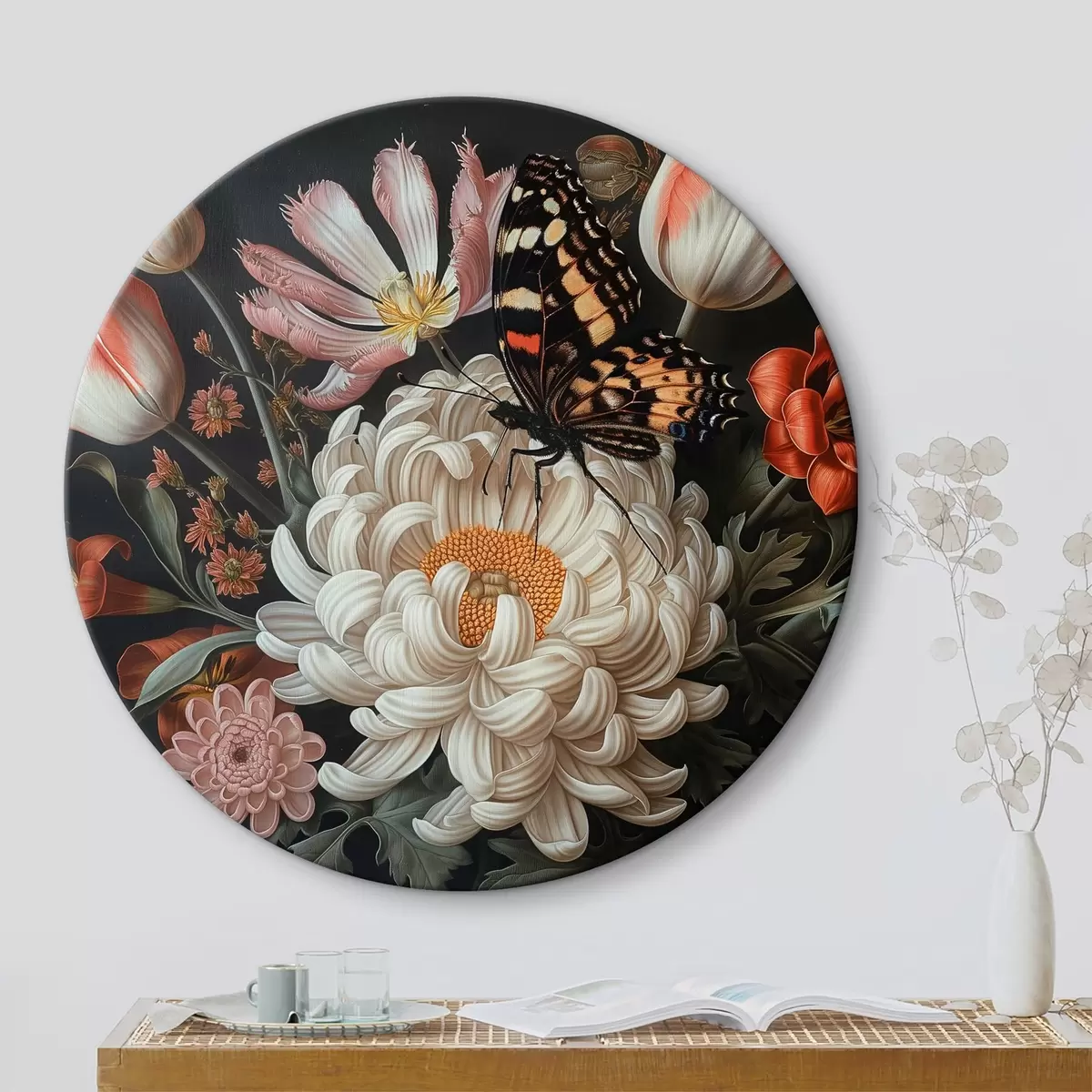 Ronde schilderijen Chrysanten, tulpen, vlinder Nr r39953
