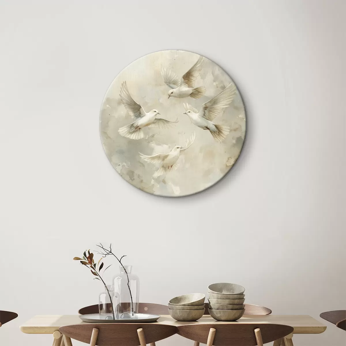 Ronde schilderijen Aquarel vliegende vogels, zachte beige en witte kleuren, duiven Nr r39976
