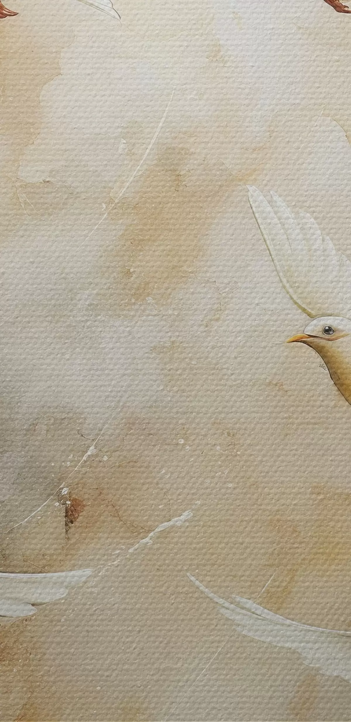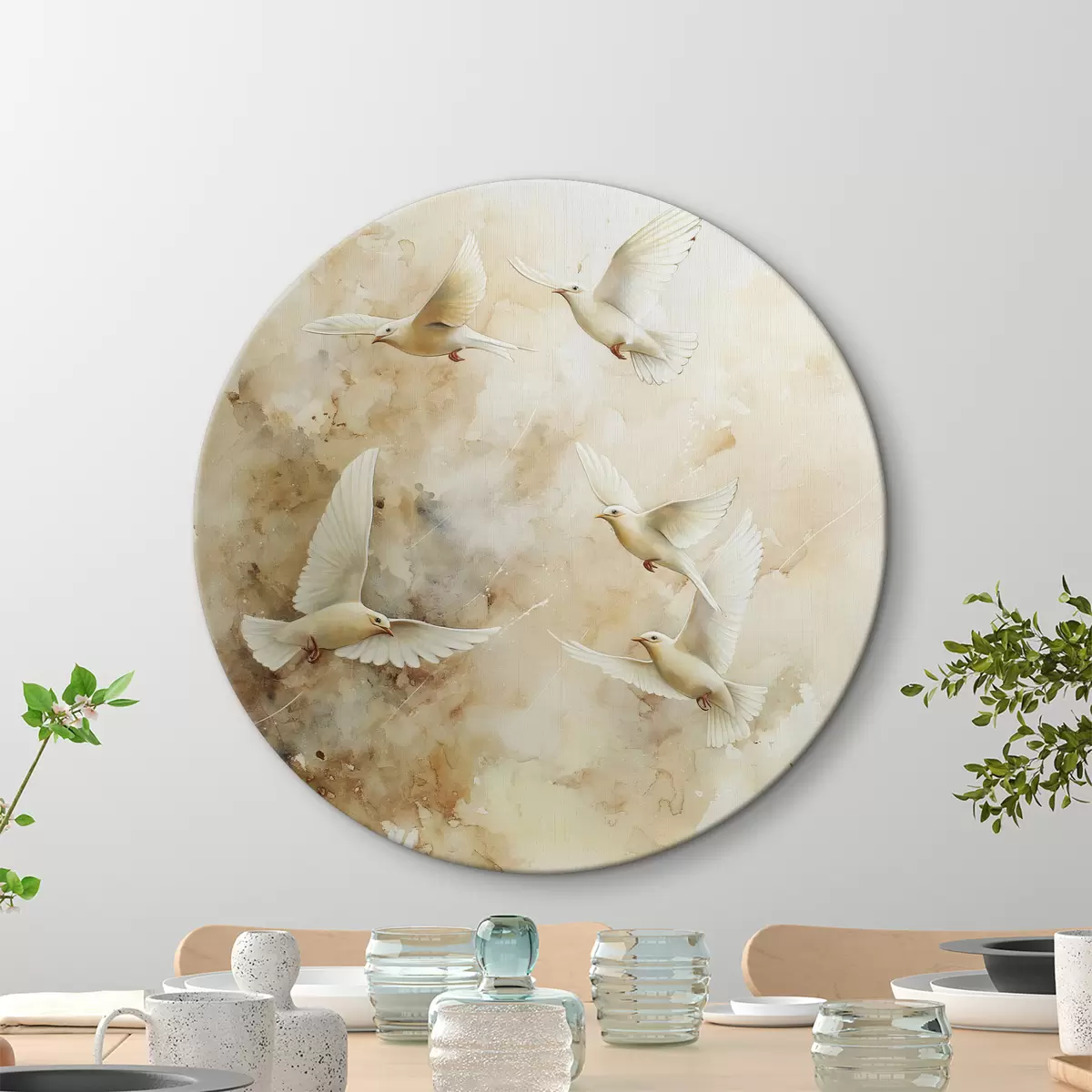 Ronde schilderijen Aquarel vliegende duiven, zachte beige en witte kleuren Nr r39977
