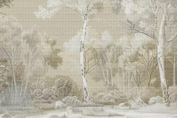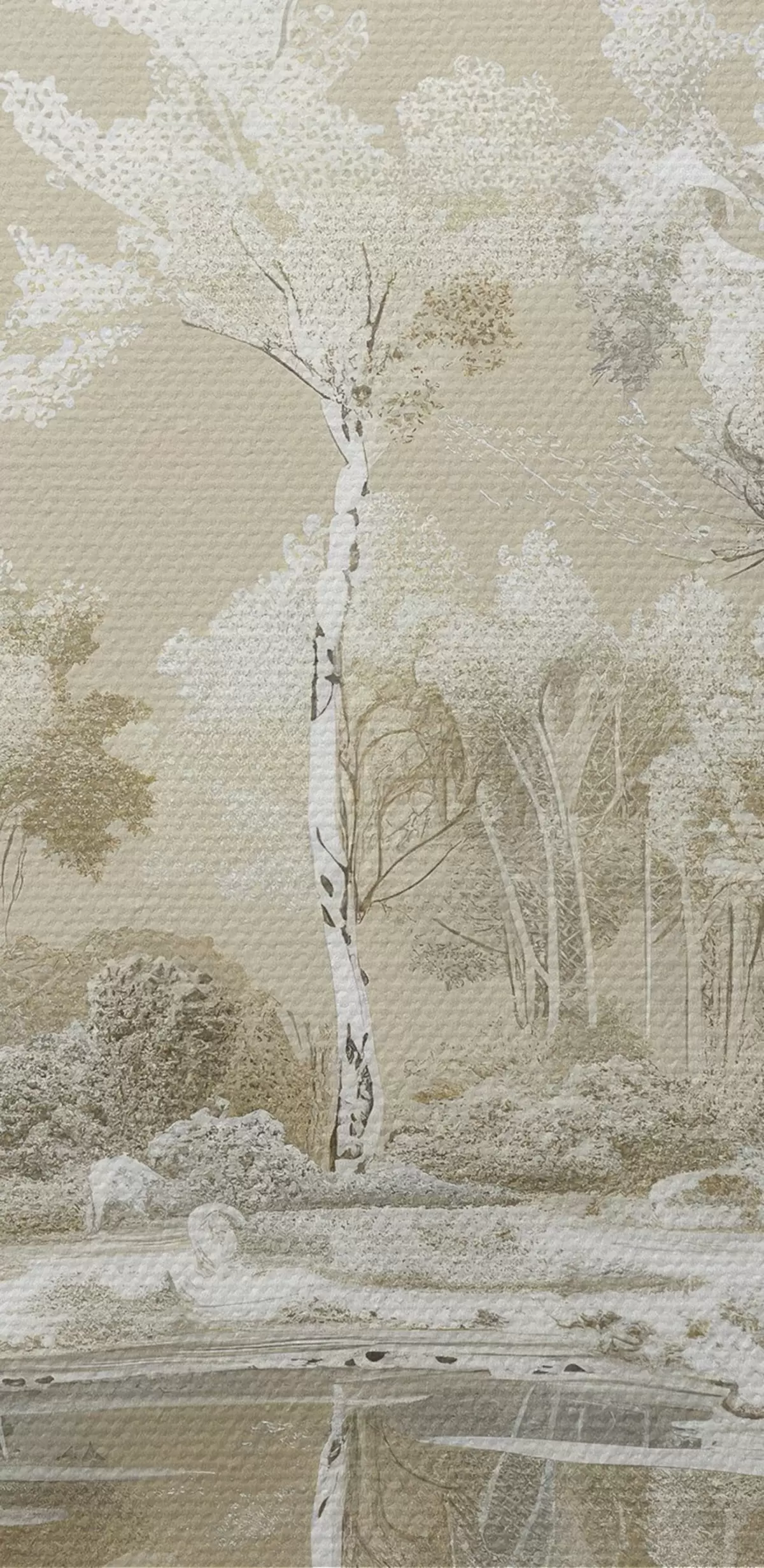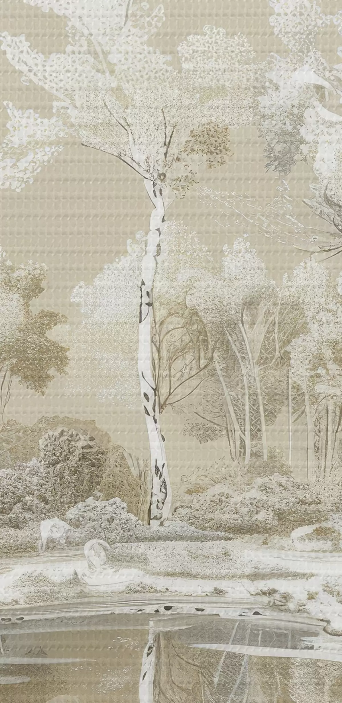 Ronde schilderijen Prachtig boslandschap, vijver en bomen, beige en witte kleuren Nr r39979
