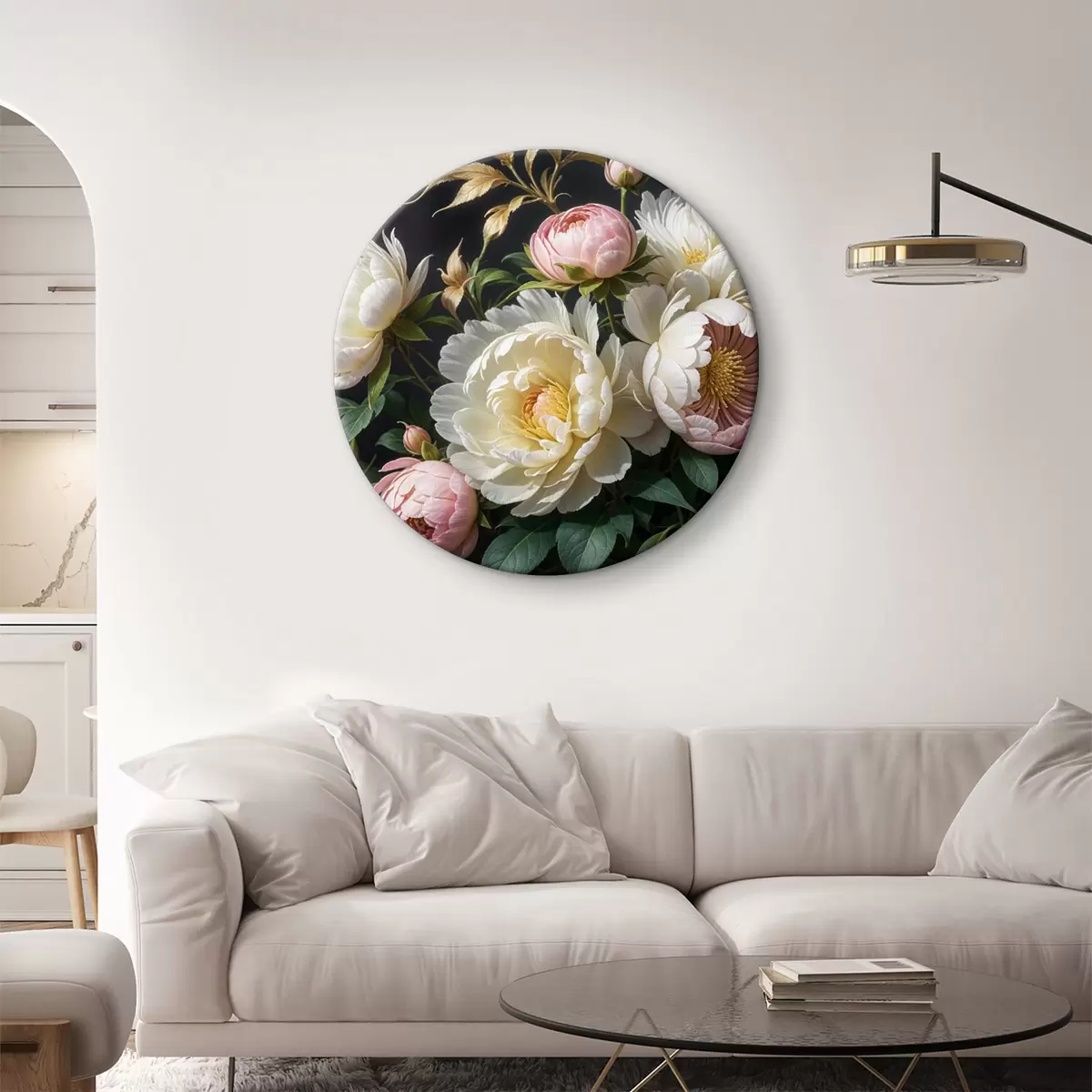 Ronde schilderijen Een boeket van grote, weelderige witte en roze pioenrozen met groene bladeren tegen een donkere achtergrond Nr r40014